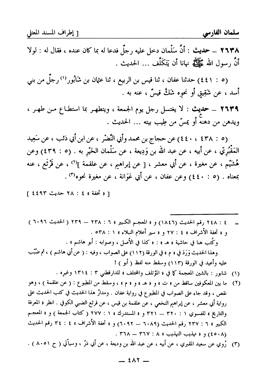 2639 -[خ] حديث: لا يغتسل رجل يوم الجمعة ويتطهر بما استطاع من طهر ويدهن من دهنه أو يمس من طيب بيته ... ... . الحديث (5: 438، 440) عن حجاج بن محمد وأبي النضر عن ابن أبي ذئب عن سعيد المقبري عن أبيه عن عبد الله بن وديعة عن سلمان الخير به (5: 439) وعن هشيم عن مغيرة عن أبي معشر عن إبراهيم عن علقمة عن قرثع عنه بمعناه (5: 440) وعن عفان عن أبي عوانة عن مغيرة نحوه
