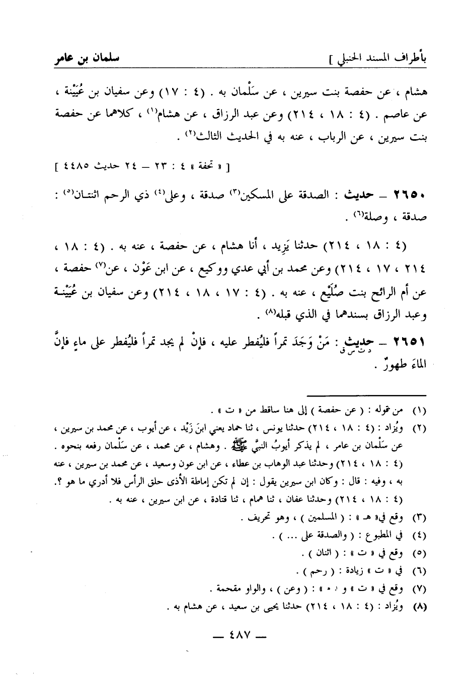 2650 - حديث: الصدقة على المسكين صدقة وعلى ذي الرحم اثنتان صدقة وصلة (4: 18، 214) حدثنا يزيد أنا هشام عن حفصة عنه به (4: 18، 214، 17، 214) وعن محمد بن أبي عدي ووكيع عن ابن عون عن حفصة عن أم الرائح بنت صليع عنه به (4: 17، 18، 214) وعن سفيان بن عيينة وعبد الرزاق بسندهما في الذي قبله