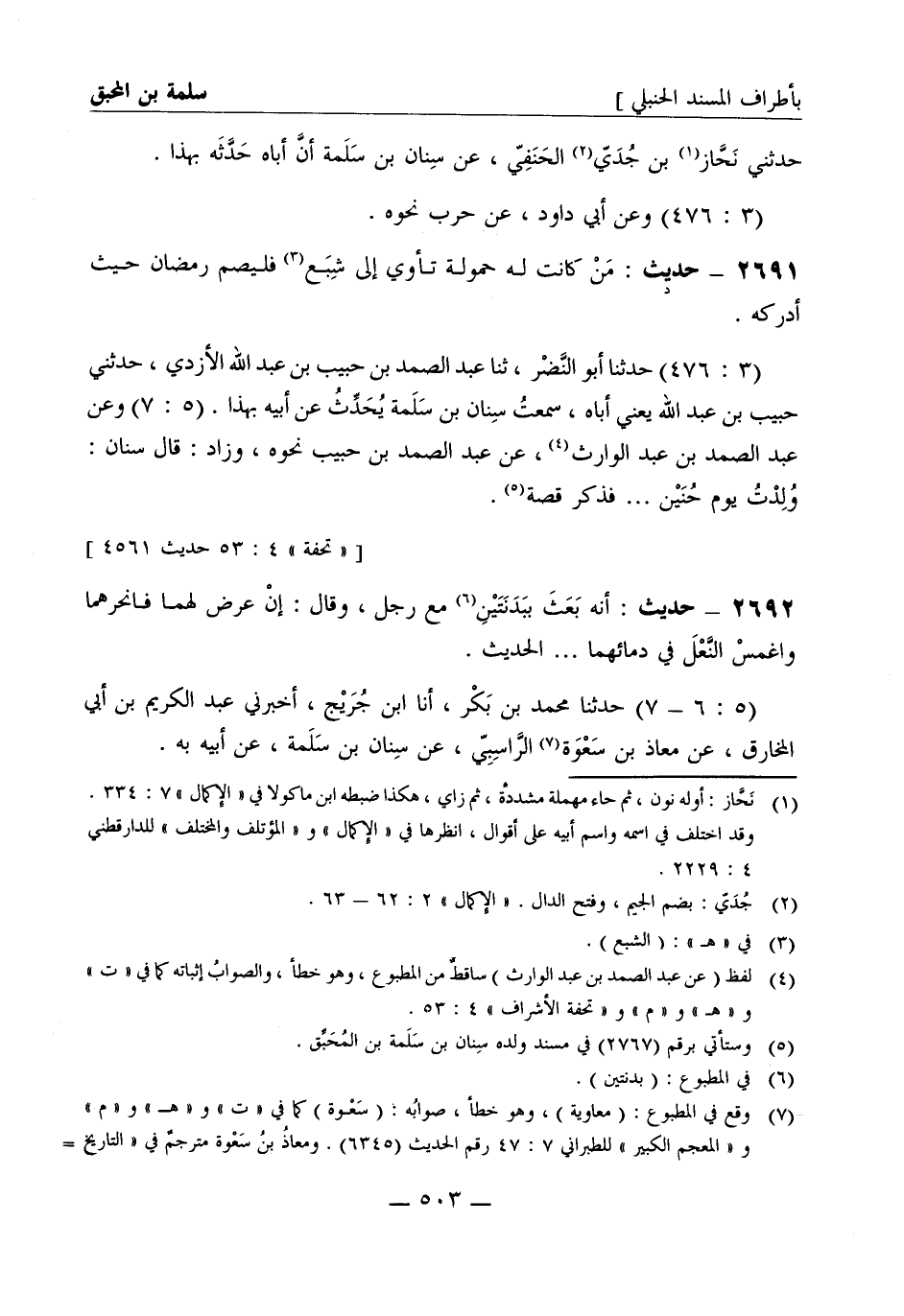 2691 -[د] حديث: من كانت له حمولة تأوي إلى شبع فليصم رمضان حيث أدركه (3: 476) حدثنا أبو النضر ثنا عبد الصمد بن حبيب بن عبد الله الأزدي حدثني حبيب بن عبد الله يعني أباه سمعت سنان بن سلمة يحدث عن أبيه بهذا (5: 7) وعن عبد الصمد بن عبد الوارث عن عبد الصمد بن حبيب نحوه وزاد قال سنان ولدت يوم حنين..... فذكر قصة