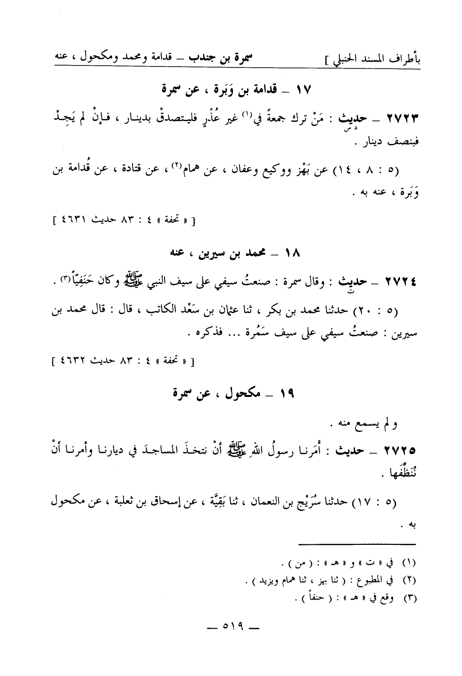2723 -[د س] حديث: من ترك جمعة في غير عذر فليتصدق بدينار، فإن لم يجد فبنصف دينار. (5: 8، 14) عن بهز ووكيع وعفان، عن همام، عن قتادة، عن قدامة بن وبرة عنه به.