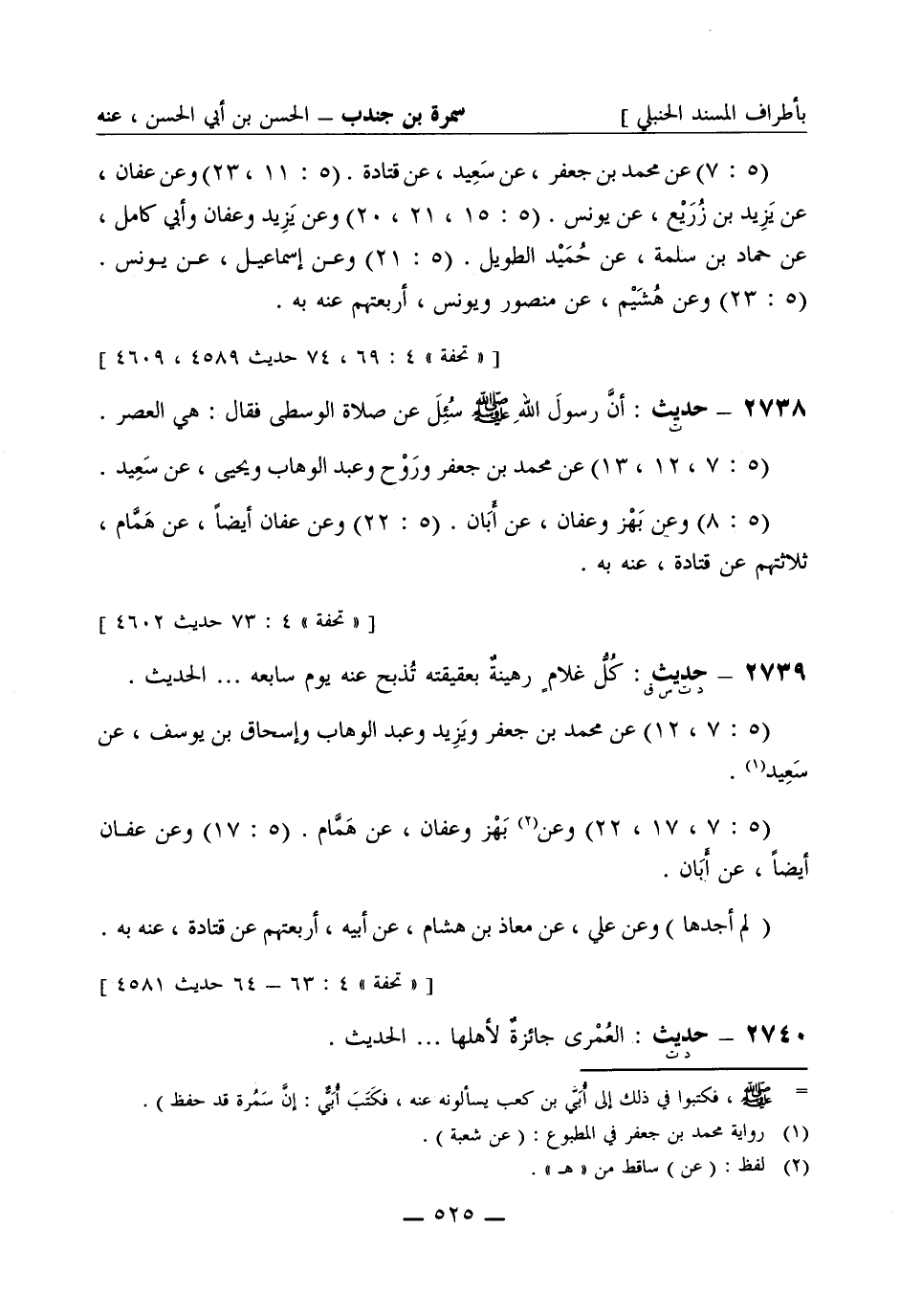 2738 -[ت] حديث: أن رسول الله صَلَّى اللَّهُ عَلَيْهِ وَسَلَّمَ سئل عن صلاة الوسطى فقال: هي العصر. (5: 7، 12، 13) عن محمد بن جعفر وروح وعبد الوهاب ويحيى، عن سعيد. (5: 8) وعن بهز وعفان، عن أبان. (5: 22) وعن عفان أيضا، عن همام، ثلاثتهم عن قتادة، عنه به.