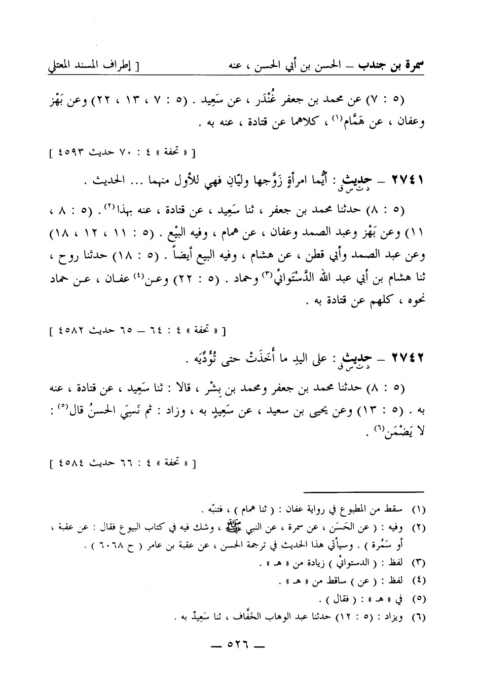 2741 -[د ت س ق] حديث: أيما امرأة زوجها وليان فهي للأول منها ... . الحديث (5: 8) حدثنا محمد بن جعفر، ثنا سعيد، عن قتادة، عنه بهذا. (5: 8، 11) وعن بهز وعبد الصمد وعفان، عن همام، وفيه البيع. (5: 11، 12، 18) وعن عبد الصمد وأبي قطن، عن هشام، وفيه البيع أيضا. (5: 18) حدثنا روح، ثنا هشام بن أبي عبد الله الدستوائي وحماد. (5: 22) وعن عفان، عن حماد نحوه كلهم عن قتادة به.