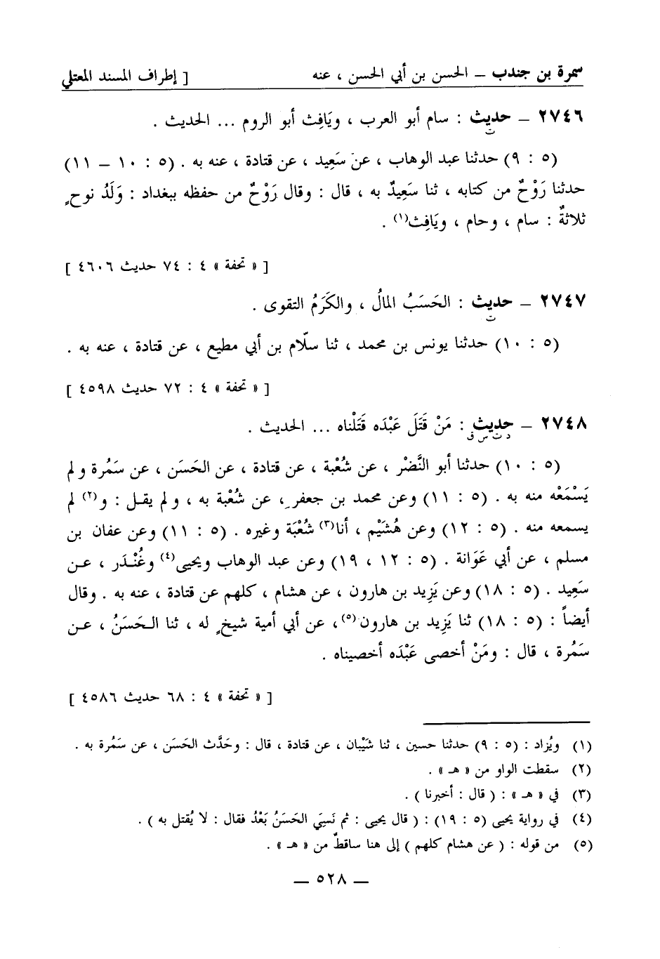 2748 -[د ت س ق] حديث: من قتل عبده قتلناه ... الحديث. (5: 10) حدثنا أبو النضر، عن شعبة، عن قتادة، عن الحسن، عن سمرة ولم يسمعه منه به. (5: 11) وعن محمد بن جعفر، عن شعبة به، ولم يقل: ولم يسمعه منه. (5: 12) وعن هشيم أنا شعبة وغيره. (5: 11) وعن عفان بن مسلم عن أبي عوانة. (5: 12، 19) وعن عبد الوهاب ويحيى وغندر، عن سعيد. (5: 18) وعن يزيد بن هارون، عن هشام كلهم عن قتادة عنه به. وقال أيضا: (5: 18) ثنا يزيد بن هارون، عن أبي أمية شيخ له ثنا الحسن عن سمرة قال: ومن أخصى عبده أخصيناه.