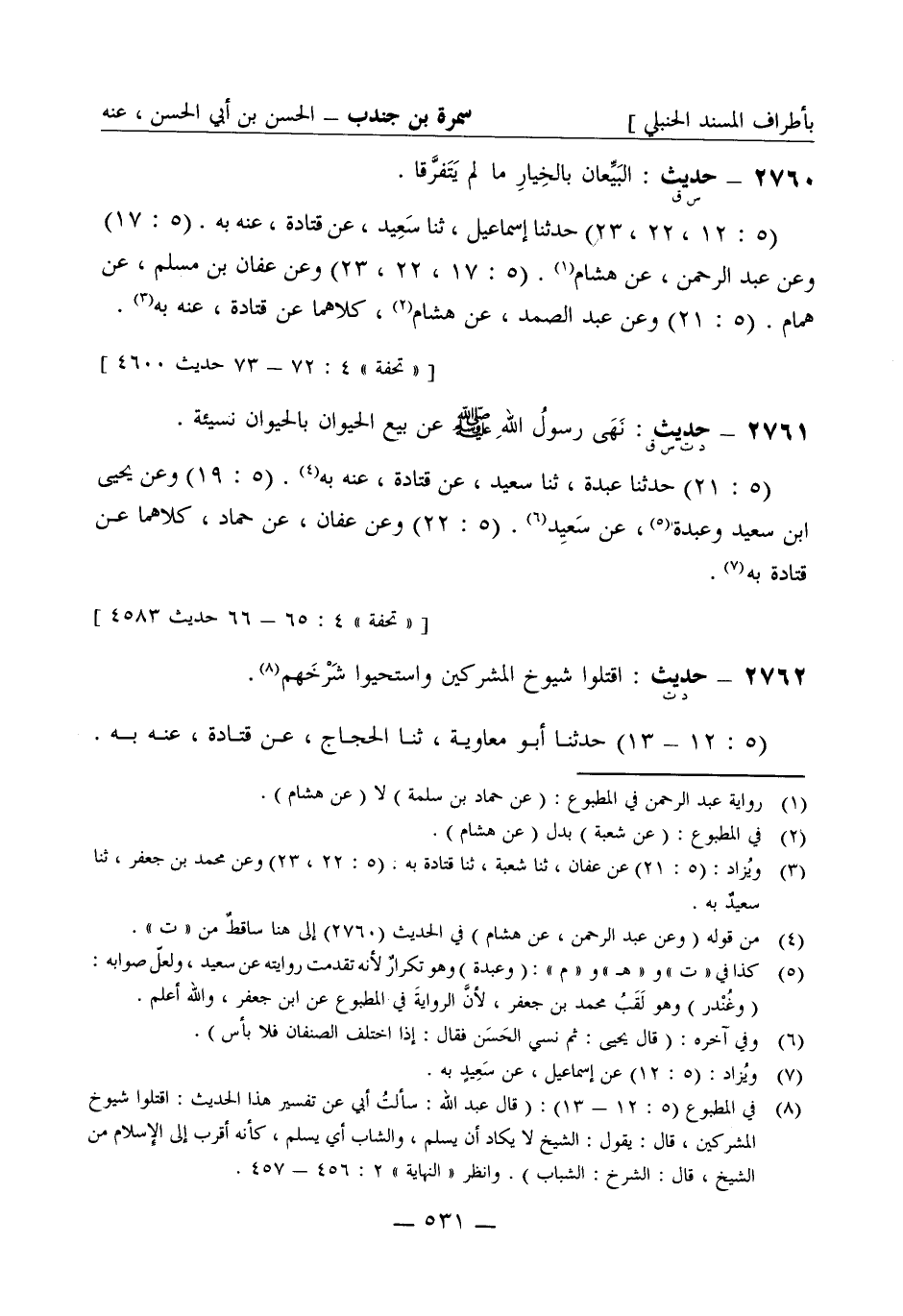 2761 -[د ت س ق] حديث: نهى رسول الله صَلَّى اللَّهُ عَلَيْهِ وَسَلَّمَ عن بيع الحيوان بالحيوان نسيئة. (5: 21) حدثنا عبدة، ثنا سعيد، عن قتادة، عنه به. (5: 19) وعن يحيى بن سعيد وعبدة، عن سعيد. (5: 22) وعن عفان عن حماد كلاهما عن قتادة به.