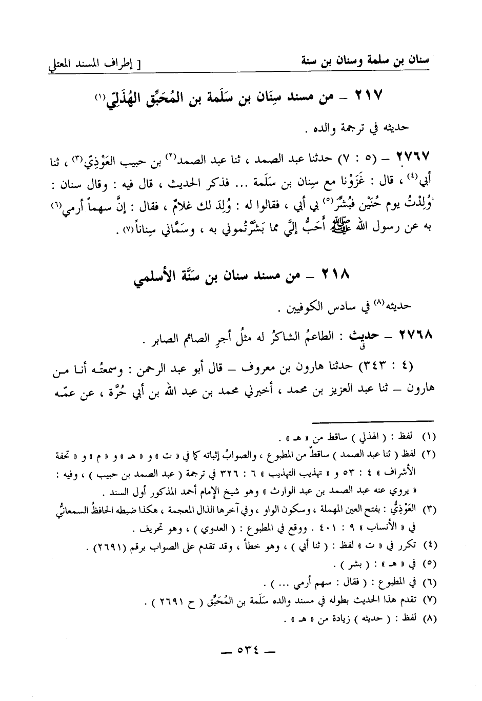 2767 - (5: 7) حدثنا عبد الصمد، ثنا عبد الصمد بن حبيب العوذي، ثنا أبي قال: غزونا مع سنان بن سلمة ... . فذكر الحديث، قال فيه: وقال سنان: ولدت يوم حنين فبشر بي أبي فقالوا له: ولد لك غلام، فقال: إن سهما أرمي به عن رسول الله صَلَّى اللَّهُ عَلَيْهِ وَسَلَّمَ أحب إلي مما بشرتموني به، وسماني سنانا.