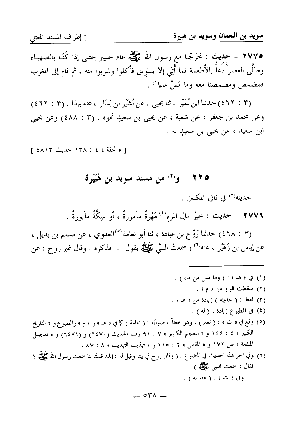 2775 -[خ س ق] حديث: خرجنا مع رسول الله صَلَّى اللَّهُ عَلَيْهِ وَسَلَّمَ عام خيبر حتى إذا كنا بالصهباء وصلى العصر دعا بالأطعمة فما أتي إلا بسويق فأكلوا وشربوا منه، ثم قام إلى المغرب فمضمض ومضمضنا معه وما مس ماء. (3: 462) حدثنا ابن نمير، ثنا يحيى، عن بشير بن يسار، عنه بهذا. (3: 462) وعن محمد بن جعفر، عن شعبة، عن يحيى بن سعيد نحوه. (3: 488) وعن يحيى بن سعيد، عن يحيى بن سعيد به.