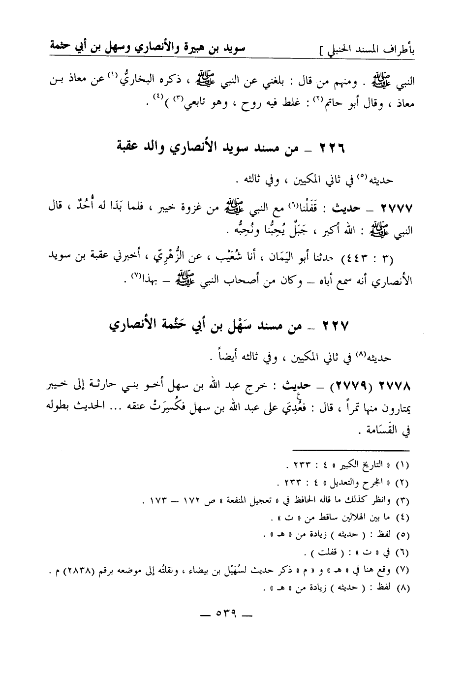 2777 - حديث: قفلنا مع النبي صَلَّى اللَّهُ عَلَيْهِ وَسَلَّمَ من غزوة خيبر، فلما بدا له أحد، قال النبي صَلَّى اللَّهُ عَلَيْهِ وَسَلَّمَ: الله أكبر، جبل يحبنا ونحبه. (3: 443) حدثنا أبو اليمان، أنا شعيب، عن الزهري، أخبرني عقبة بن سويد الأنصاري أنه سمع أباه - وكان من أصحاب النبي صَلَّى اللَّهُ عَلَيْهِ وَسَلَّمَ - بهذا.