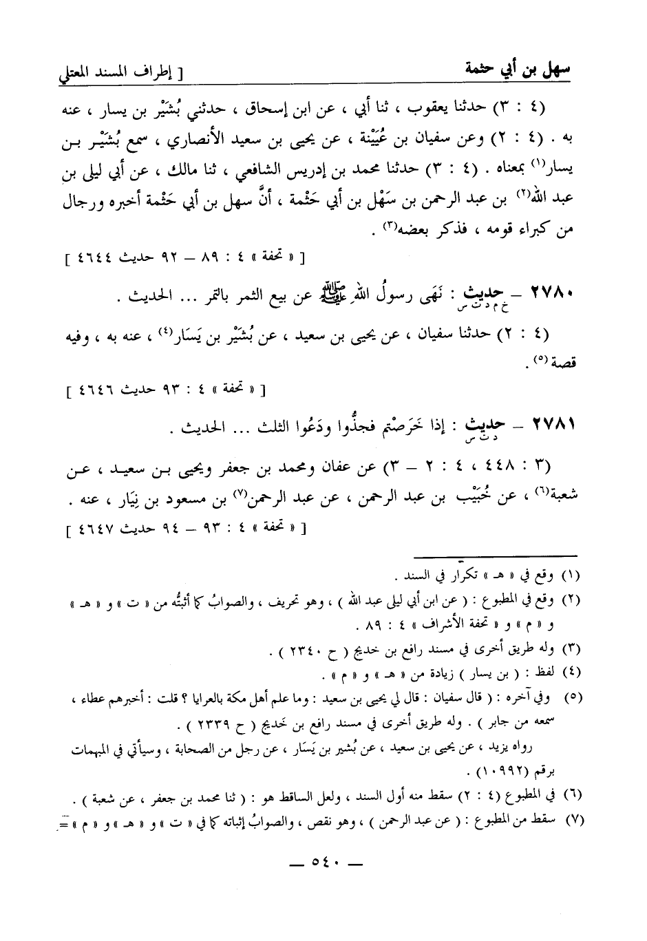 2780 -[خ م د ت س] حديث: نهى رسول الله صَلَّى اللَّهُ عَلَيْهِ وَسَلَّمَ عن بيع الثمر بالتمر ... الحديث. (4: 2) حدثنا سفيان عن يحيى بن سعيد، عن بشير بن يسار، عنه به، وفيه قصة.