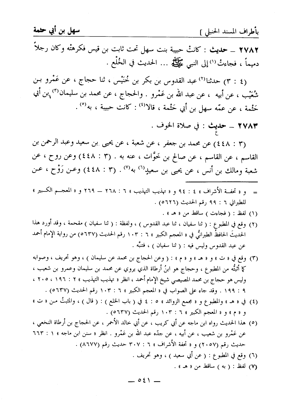 2782 - حديث: كانت حبيبة بنت سهل تحت ثابت بن قيس فكرهته وكان رجلا دميما، فجاءت إلى النبي صَلَّى اللَّهُ عَلَيْهِ وَسَلَّمَ ... الحديث في الخلع. (4: 3) حدثنا عبد القدوس بن بكر بن خنيس، ثنا حجاج، عن عمرو بن شعيب، عن أبيه، عن عبد الله بن عمرو، والحجاج، عن محمد بن سليمان بن أبي حثمة عن عمه سهل بن أبي حثمة، قالا: كانت حبيبة، به.