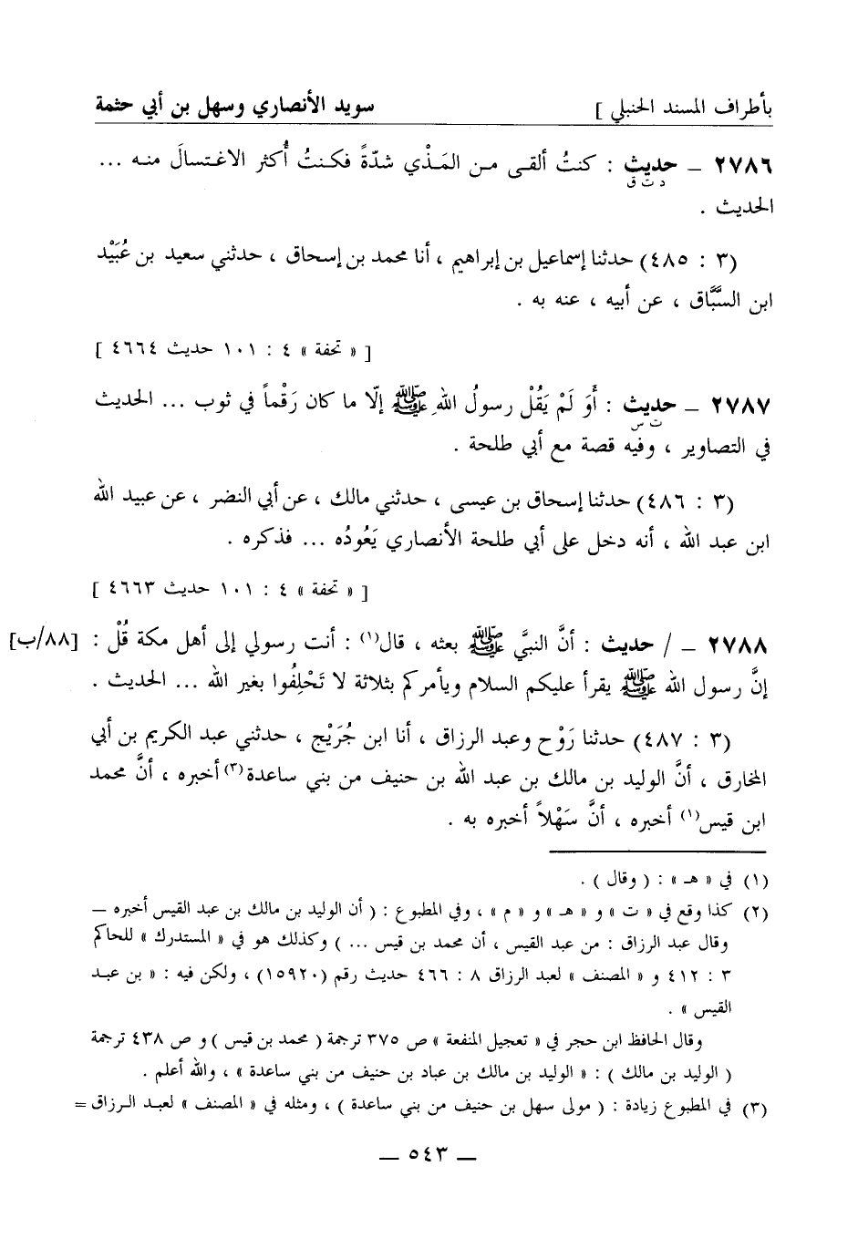 2788 - حديث: أن النبي صَلَّى اللَّهُ عَلَيْهِ وَسَلَّمَ بعثه، قال: أنت رسولي إلى أهل مكة قل: إن رسول الله صَلَّى اللَّهُ عَلَيْهِ وَسَلَّمَ يقرأ عليكم السلام ويأمركم بثلاثة لا تحلفوا بغير الله ... الحديث. (3: 487) حدثنا روح وعبد الرزاق، أنا ابن جريج، حدثني عبد الكريم بن أبي المخارق، أن الوليد بن مالك بن عبد الله بن حنيف من بني ساعدة أخبره أن محمد بن قيس أخبره أن سهلا أخبره به.