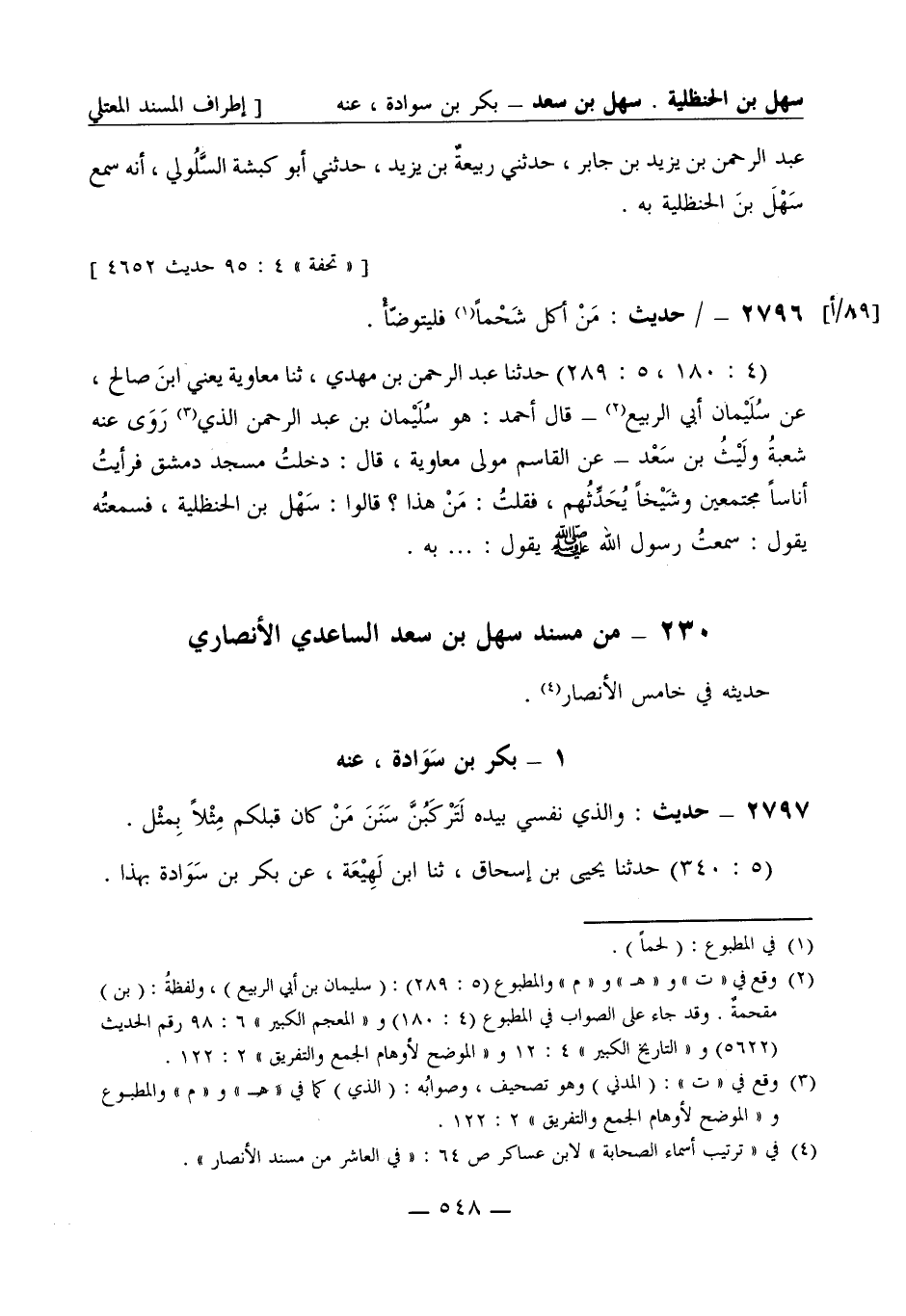2796 - حديث: من أكل شحما فليتوضأ. (4: 180، 5: 289) حدثنا عبد الرحمن بن مهدي، ثنا معاوية يعني ابن صالح، عن سليمان أبي الربيع - قال أحمد: هو سليمان بن عبد الرحمن الذي روى عنه شعبة وليث بن سعد - عن القاسم مولى معاوية، قال: دخلت مسجد دمشق فرأيت أناسا مجتمعين وشيخا يحدثهم فقلت: من هذا؟ قالوا: سهل بن الحنظلية، فسمعته يقول: سمعت رسول الله صَلَّى اللَّهُ عَلَيْهِ وَسَلَّمَ يقول: ... به.
