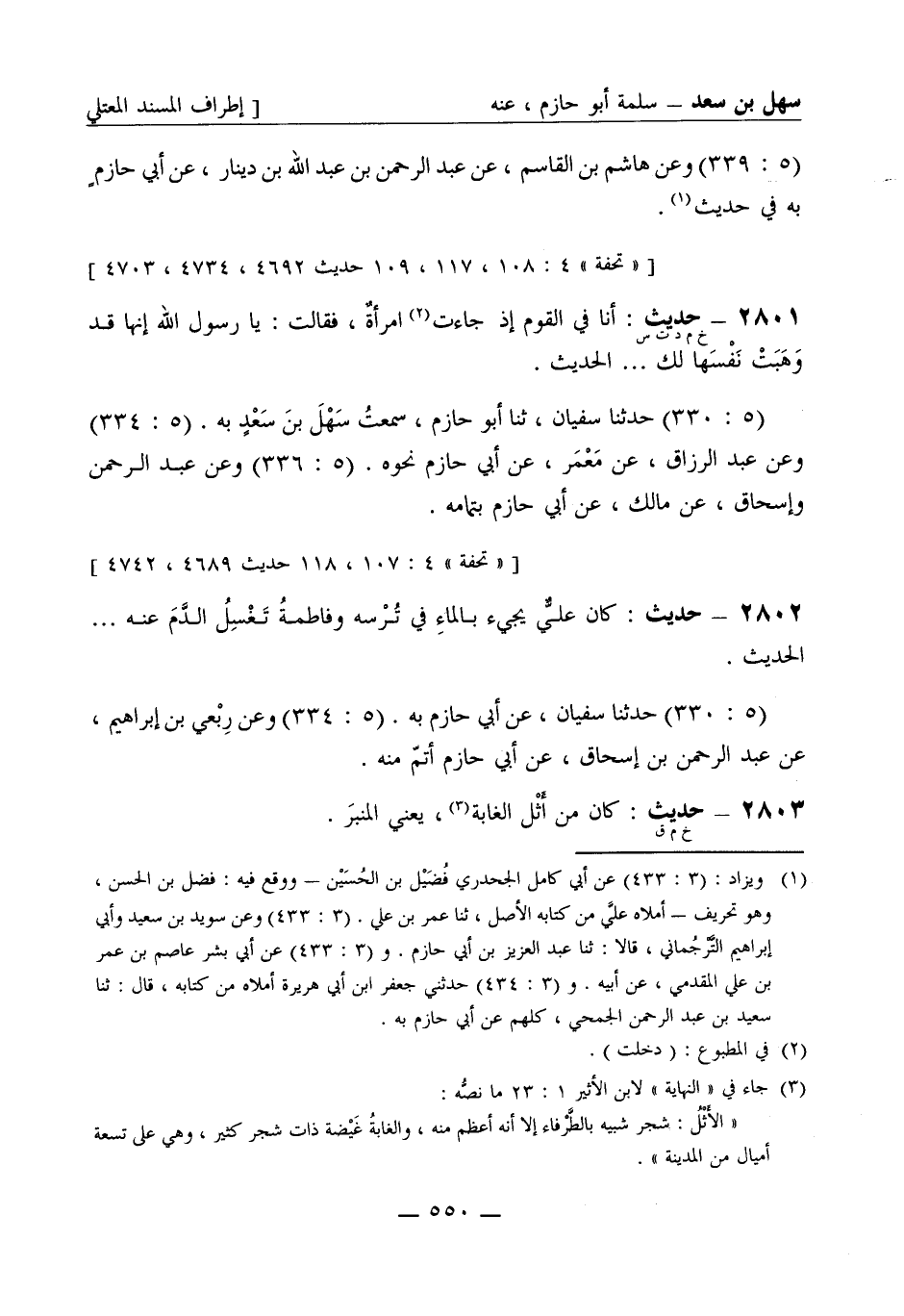 2803 -[خ م ق] حديث: كان من أثل الغابة يعني المنبر -[551]-. (5: 330) حدثنا سفيان، عن أبي حازم به. (5: 339) وعن إسحاق بن عيسى، عن عبد العزيز بن أبي حازم، عن أبيه به مطولا بقصة المنبر. (5: 337) وعن حماد بن خالد، عن عبد الله بن عمر، عن عباس بن سهل بن سعد، عن أبيه بمعناه.