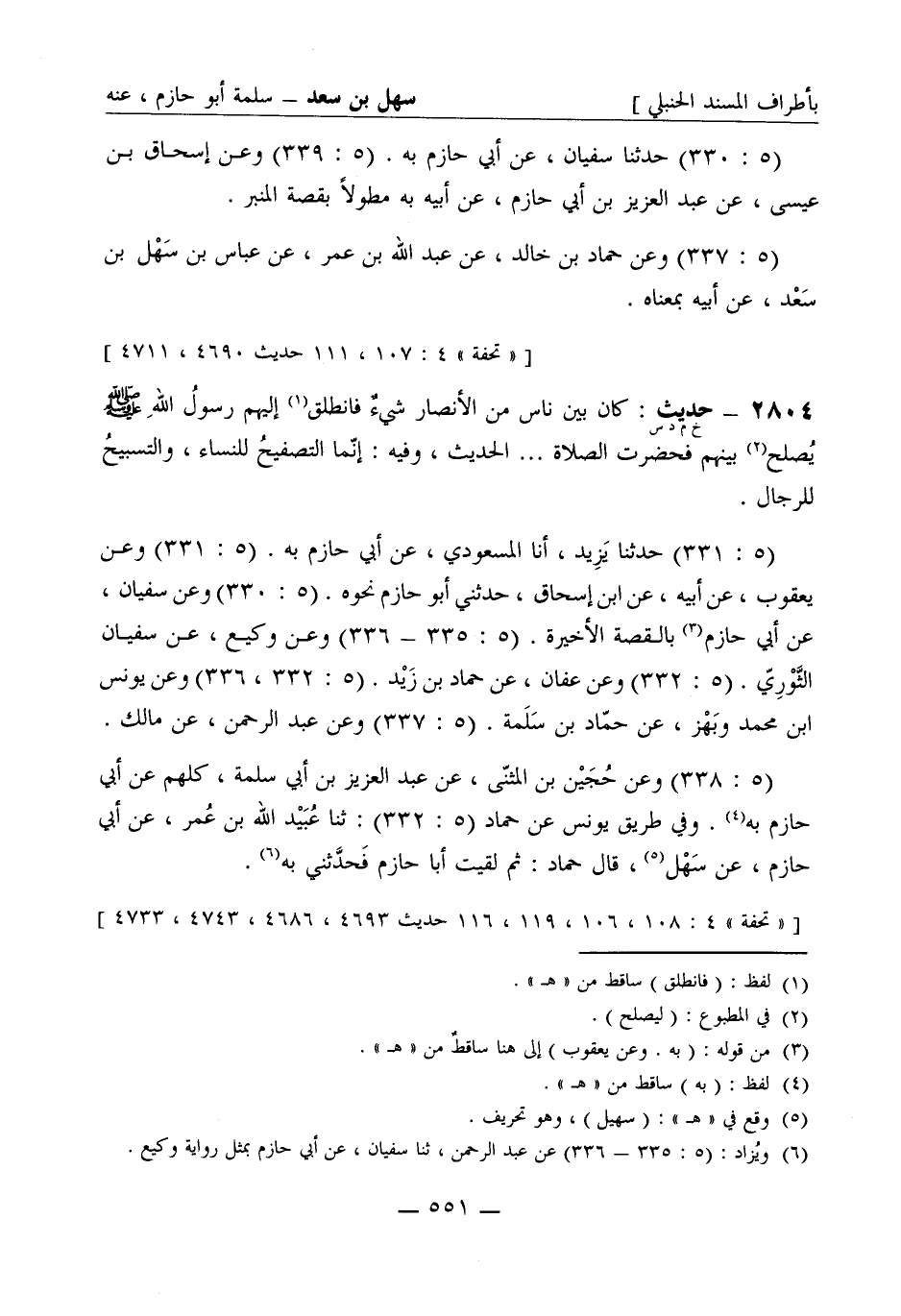 2804 -[خ م د س] حديث: كان بين ناس من الأنصار شيء فانطلق إليهم رسول الله صَلَّى اللَّهُ عَلَيْهِ وَسَلَّمَ يصلح بينهم فحضرت الصلاة ... الحديث، وفيه: إنما التصفيح للنساء، والتسبيح للرجال. (5: 331) حدثنا يزيد أنا المسعودي عن أبي حازم به. (5: 331) وعن يعقوب، عن أبيه، عن ابن إسحاق، حدثني أبو حازم نحوه. (5: 330) وعن سفيان، عن أبي حازم بالقصة الأخيرة. (5: 335 - 336) وعن وكيع، عن سفيان الثوري. (5: 332) وعن عفان، عن حماد بن زيد، (5: 332، 336) وعن يونس بن محمد وبهز، عن حماد بن سلمة. (5: 337) وعن عبد الرحمن، عن مالك. (5: 338) وعن حجين بن المثنى، عن عبد العزيز بن أبي سلمة، كلهم عن أبي حازم به. وفي طريق يونس عن حماد (5: 332) ثنا عبيد الله بن عمر، عن أبي حازم، عن سهل، قال حماد: ثم لقيت أبا حازم فحدثني به.