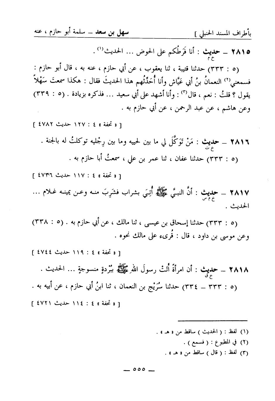 2815 -[خ م] حديث: أنا فرطكم على الحوض ... الحديث (5: 333) حدثنا قتيبة، ثنا يعقوب عن أبي حازم عنه به قال أبو حازم: فسمعني النعمان بن أبي عياش وأنا أحدثهم هذا الحديث فقال: هكذا سمعت سهلا يقول؟ قلت: نعم، قال: وأنا أشهد على أبي سعيد ... فذكره بزيادة. (5: 339) وعن هاشم، عن عبد الرحمن، عن أبي حازم به.