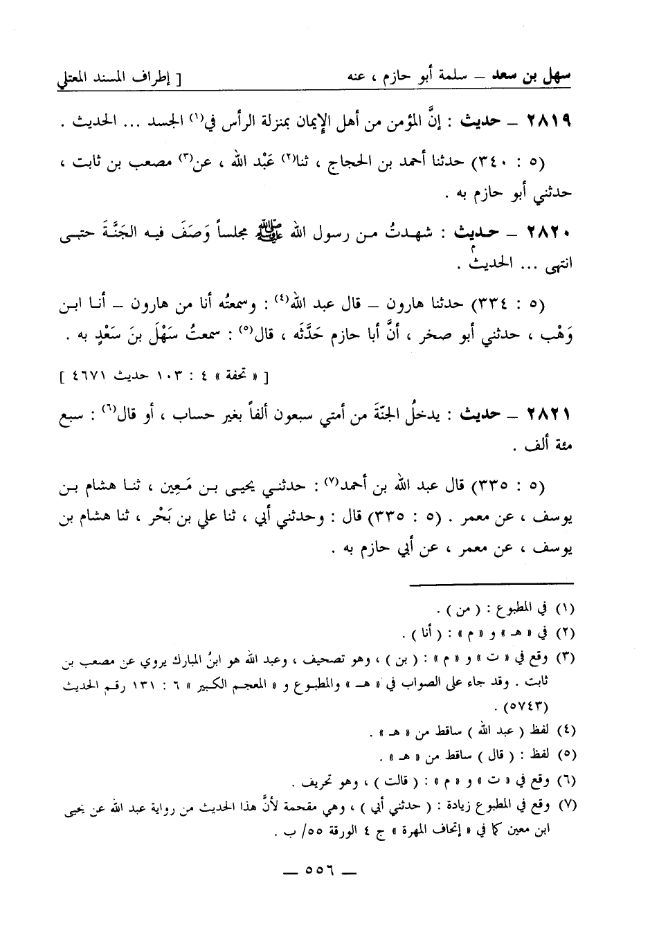 2821 - حديث: يدخل الجنة من أمتي سبعون ألفا بغير حساب، أو قال: سبع مائة ألف. (5: 335) قال عبد الله بن أحمد: حدثني يحيى بن معين، ثنا هشام بن يوسف، عن معمر. (5: 335) قال: وحدثني أبي، ثنا علي بن بحر، ثنا هشام بن يوسف عن معمر عن أبي حازم به.