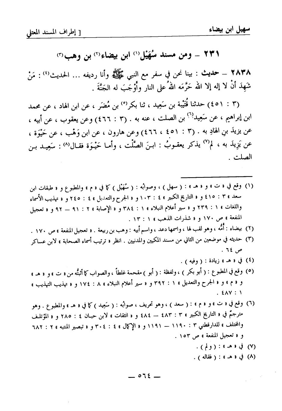 2838 - حديث: بينا نحن في سفر مع النبي صَلَّى اللَّهُ عَلَيْهِ وَسَلَّمَ وأنا رديفه ... الحديث: من شهد أن لا إله إلا الله حرمه الله على النار وأوجب له الجنة. (3: 451) حدثنا قتيبة بن سعيد، ثنا بكر بن مضر، عن ابن الهاد، عن محمد بن إبراهيم، عن سعيد بن الصلت، عنه به. (3: 466) وعن يعقوب، عن أبيه، عن يزيد بن الهاد به. (3: 451، 466) وعن هارون، عن ابن وهب، عن حيوة، عن يزيد به لم يذكر يعقوب: ابن الصلت، وأما حيوة فقال: سعيد بن الصلت.