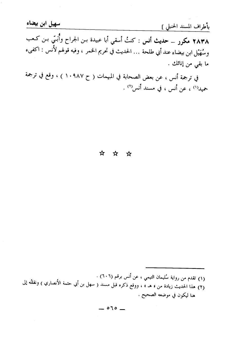 2838 - مكرر - حديث أنس: كنت أسقي أبا عبيدة بن الجراح وأبي بن كعب وسهيل ابن بيضاء عند أبي طلحة ... الحديث في تحريم الخمر، وفيه قولهم لأنس: اكفئ ما بقي من إنائك. في ترجمة أنس، عن بعض الصحابة في المبهمات (ح 10987) وقع في ترجمة حميد، عن أنس، في مسند أنس.