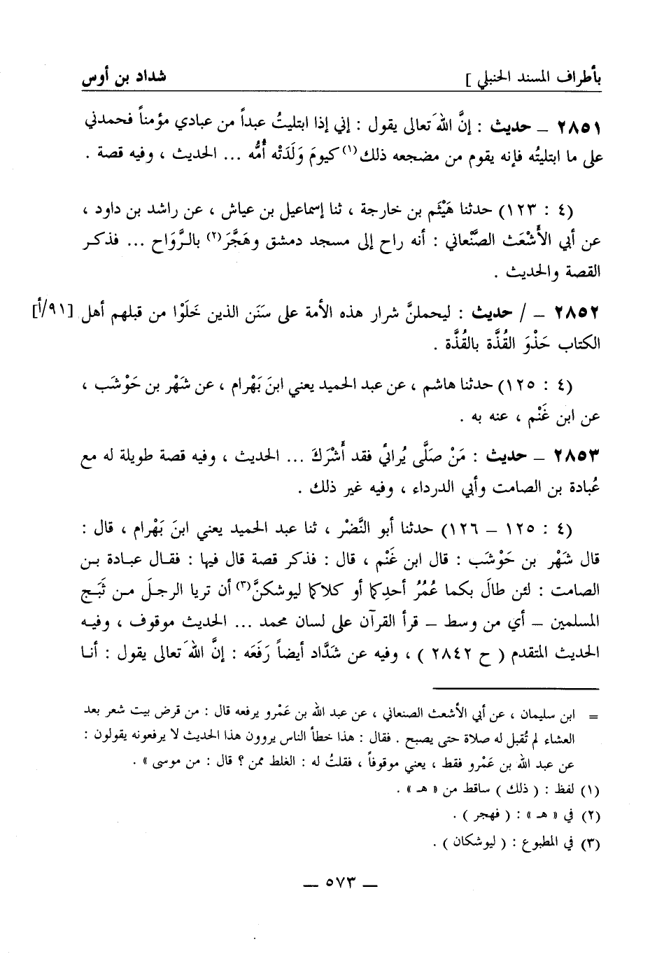 2852 - حديث: ليحملن شرار هذه الأمة على سنن الذين خلوا من قبلهم أهل الكتاب حذو القذة بالقذة. (4: 125) حدثنا هاشم عن عبد الحميد يعني ابن بهرام، عن شهر بن حوشب، عن ابن غنم، عنه به.