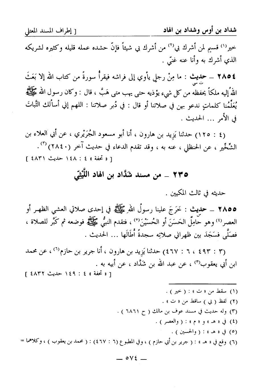 2855 -[س] حديث: خرج علينا رسول الله صَلَّى اللَّهُ عَلَيْهِ وَسَلَّمَ في إحدى صلاتي العشي الظهر أو العصر وهو حامل الحسن أو الحسين، فتقدم النبي صَلَّى اللَّهُ عَلَيْهِ وَسَلَّمَ فوضعه ثم كبر للصلاة، فصلى فسجد بين ظهراني صلاته سجدة أطالها ... الحديث. (3: 493، 6: 467) حدثنا يزيد بن هارون، أنا جرير بن حازم، عن محمد بن أبي يعقوب، عن عبد الله بن شداد، عن أبيه به.
