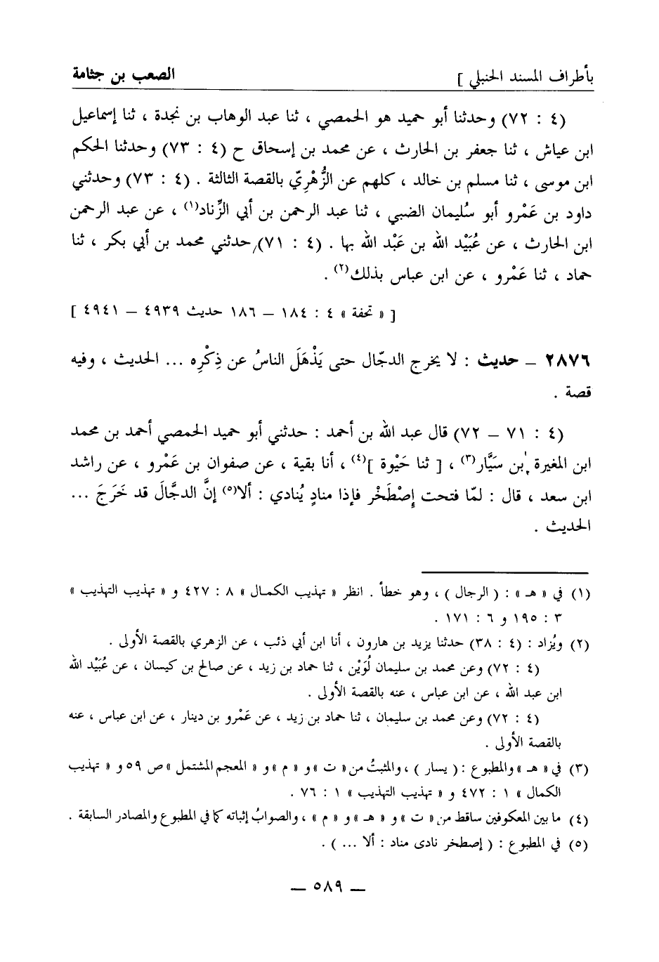 2876 - حديث: لا يخرج الدجال حتى يذهل الناس عن ذكره ... الحديث وفيه قصة. (4: 71 - 72) قال عبد الله بن أحمد: حدثني أبو حميد الحمصي أحمد بن محمد بن المغيرة بن سيار، ثنا حيوة، أنا بقية عن صفوان بن عمرو، عن راشد بن سعد، قال: لما فتحت إصطخر فإذا مناد ينادي: ألا إن الدجال قد خرج ... الحديث. -[590]- قلت: هذا الحديث أخرجه ابن السكن في ترجمة الصعب في الصحابة، وقال: صالح الإسناد.