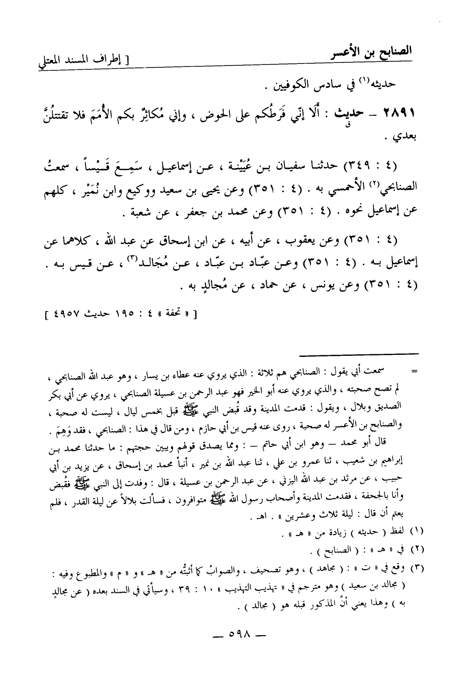 2891 -[ق] حديث: ألا إني فرطكم على الحوض، وإني مكاثر بكم الأمم فلا تقتتلن بعدي. (4: 349) حدثنا سفيان بن عيينة، عن إسماعيل، سمع قيسا سمعت الصنابحي الأحمسي به. (4: 351) وعن يحيى بن سعيد ووكيع وابن نمير، كلهم عن إسماعيل نحوه. (4: 351) وعن محمد بن جعفر، عن شعبة (4: 351) وعن يعقوب عن أبيه عن ابن إسحاق عن عبد الله كلاهما عن إسماعيل به. (4: 351) وعن عباد بن عباد عن مجالد عن قيس به (4: 351) وعن يونس، عن حماد، عن مجالد به.