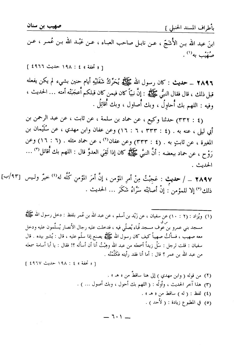 2897 -[م] حديث: عجبت من أمر المؤمن، إن أمر المؤمن كله له خير وليس ذلك إلا للمؤمن: إن أصابته سراء شكر ... الحديث -[602]-. (4: 332) حدثنا بهز وحجاج، قالا: ثنا سليمان بن المغيرة، عن ثابت، عن عبد الرحمن بن أبي ليلى، عنه به. (4: 333، 6: 16، 15) وعن عفان وعبد الرحمن بن مهدي، كلاهما عن سليمان نحوه. (6: 16) وعن عفان، عن حماد، عن ثابت نحوه.