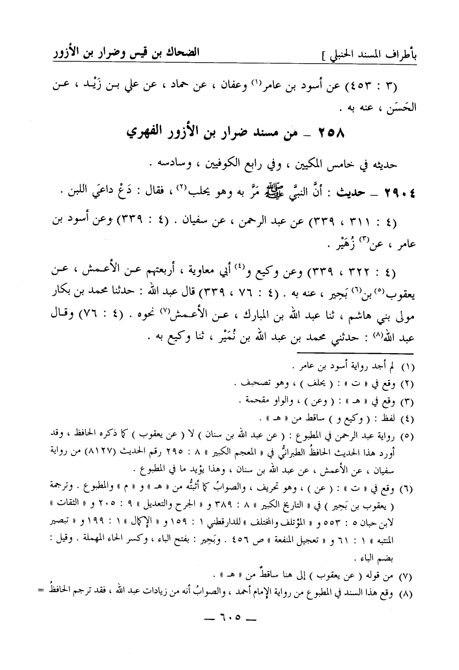 2904 - حديث: أن النبي صَلَّى اللَّهُ عَلَيْهِ وَسَلَّمَ مر به وهو يحلب، فقال: دع داعي اللبن. (4: 311، 339) عن عبد الرحمن، عن سفيان. (4: 339) وعن أسود بن عامر، عن زهير. (4: 322، 339) وعن وكيع وأبي معاوية، أربعتهم عن الأعمش، عن يعقوب بن بحير، عنه به. (4: 76، 339) قال عبد الله: حدثنا محمد بن بكار مولى بني هاشم، ثنا عبد الله بن المبارك، عن الأعمش نحوه. (4: 76) وقال عبد الله: حدثني محمد بن عبد الله بن نمير، ثنا وكيع به.