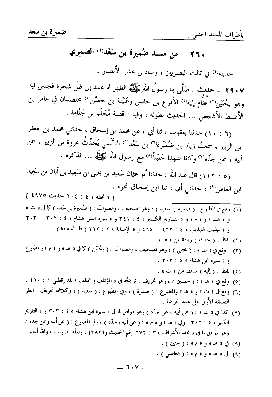 2907 -[د ق] حديث: صلى بنا رسول الله صَلَّى اللَّهُ عَلَيْهِ وَسَلَّمَ الظهر ثم عمد إلى ظل شجرة فجلس فيه وهو بحنين فقام إليه الأقرع بن حابس وعيينة بن حصن يختصمان في عامر بن الأضبط الأشجعي ... الحديث بطوله، وفيه: قصة محلم بن جثامة. (6: 10) حدثنا يعقوب، ثنا أبي، عن محمد بن إسحاق، حدثني محمد بن جعفر بن الزبير، سمعت زياد بن ضميرة بن سعد السلمي يحدث عروة بن الزبير، عن أبيه، عن جده وكانا شهدا حنينا مع رسول الله صَلَّى اللَّهُ عَلَيْهِ وَسَلَّمَ ... . فذكره. (5: 112) قال عبد الله: حدثنا أبو عثمان سعيد بن يحيى بن سعيد بن أبان بن سعيد بن العاص، حدثني أبي، ثنا ابن إسحاق نحوه.
