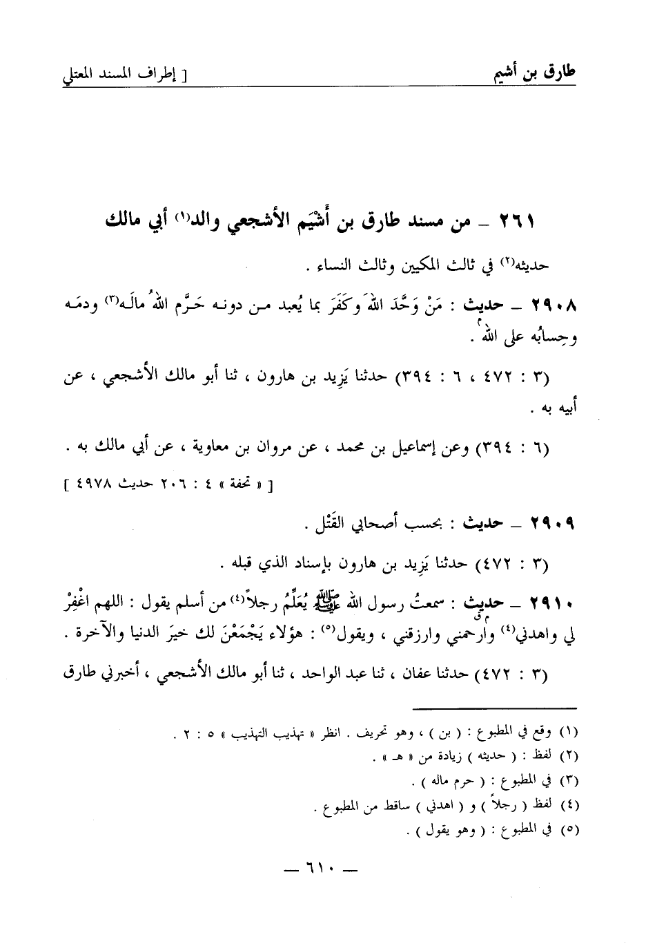 2910 -[م ق] حديث: سمعت رسول الله صَلَّى اللَّهُ عَلَيْهِ وَسَلَّمَ يعلم رجلا من أسلم يقول: اللهم اغفر لي واهدني وارحمني وارزقني، ويقول: هؤلاء يجمعن لك خير الدنيا والآخرة. (3: 472) حدثنا عفان، ثنا عبد الواحد، ثنا أبو مالك الأشجعي، أخبرني طارق -[611]- بن أشيم به. (3: 472، 6: 394) وعن يزيد بن هارون، عن أبي مالك بنحوه في حديث.