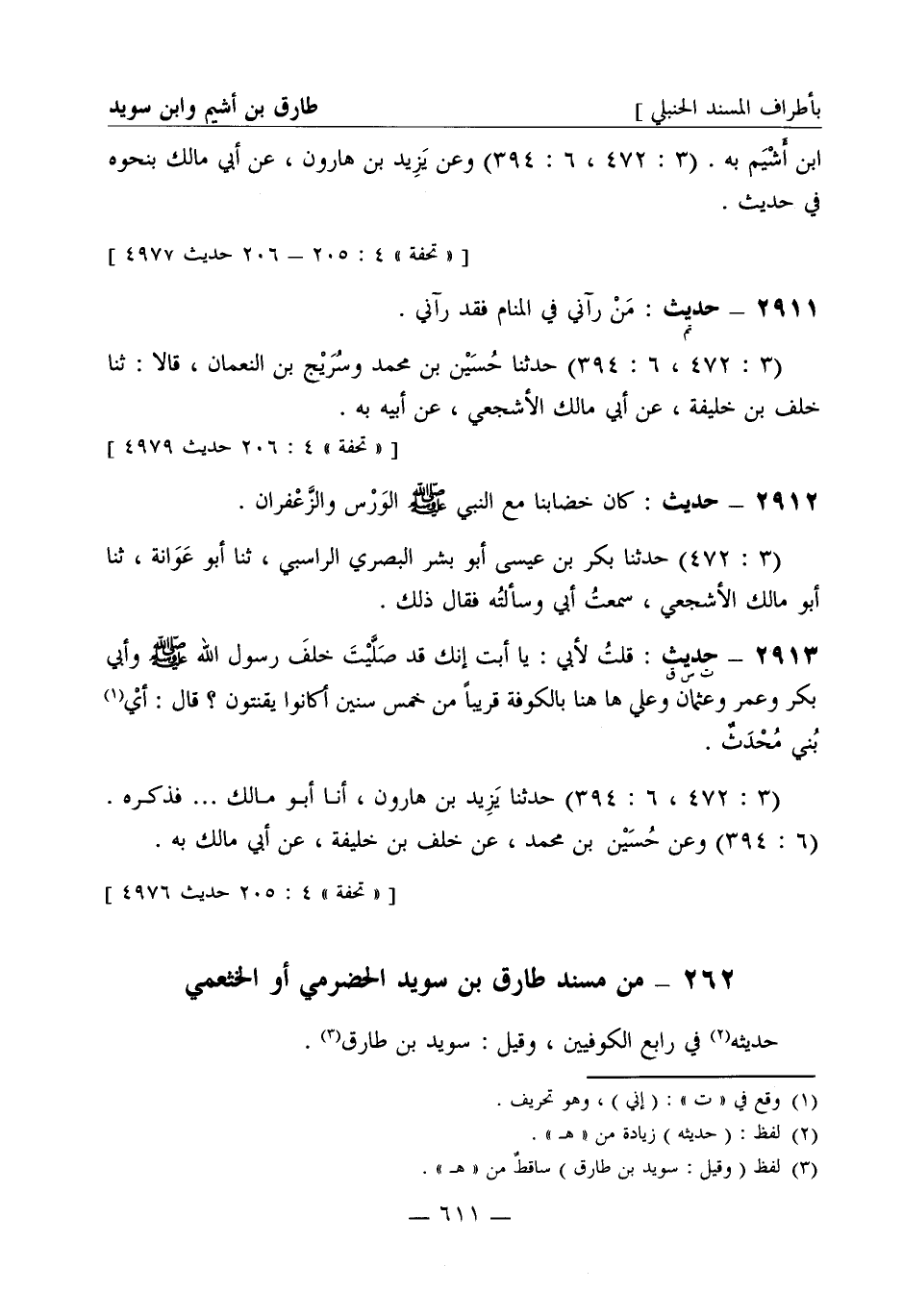 2911 -[تم] حديث: من رآني في المنام فقد رآني. (3: 472، 6: 394) حدثنا حسين بن محمد وسريج بن النعمان، قالا: ثنا خلف بن خليفة، عن أبي مالك الأشجعي، عن أبيه به.