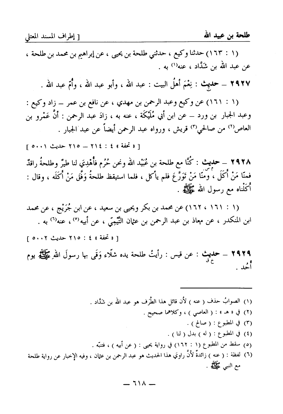 2928 -[م س] حديث: كنا مع طلحة بن عبيد الله ونحن حرم فأهدي لنا طير وطلحة راقد فمنا من أكل، ومنا من تورع فلم يأكل، فلما استيقظ طلحة وفق من أكله، وقال: أكلناه مع رسول الله صَلَّى اللَّهُ عَلَيْهِ وَسَلَّمَ. (1: 161، 162) عن محمد بن بكر ويحيى بن سعيد، عن ابن جريج، عن محمد بن المنكدر، عن معاذ بن عبد الرحمن بن عثمان التيمي، عن أبيه، عنه به.