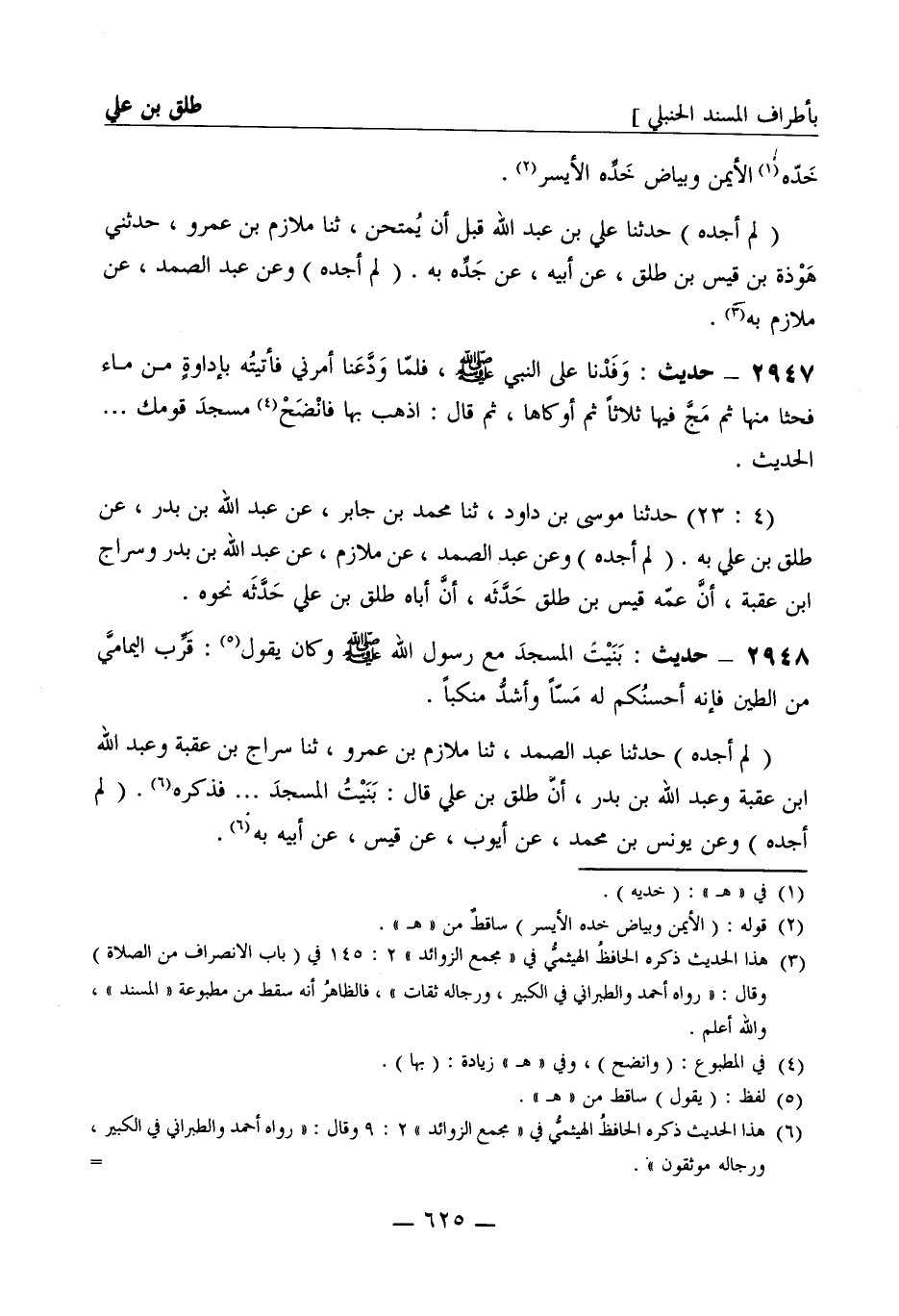 2947 - حديث: وفدنا على النبي صَلَّى اللَّهُ عَلَيْهِ وَسَلَّمَ، فلما ودعنا أمرني فأتيته بإداوة من ماء فحثا منها ثم مج فيها ثلاثا ثم أوكاها، ثم قال: اذهب بها فانضح مسجد قومك ... الحديث. (4: 23) حدثنا موسى بن داود، ثنا محمد بن جابر، عن عبد الله بن بدر، عن طلق بن علي به. (لم أجده) وعن عبد الصمد، عن ملازم، عن عبد الله بن بدر وسراج بن عقبة، أن عمه قيس بن طلق حدثه، أن أباه طلق بن علي حدثه نحوه.