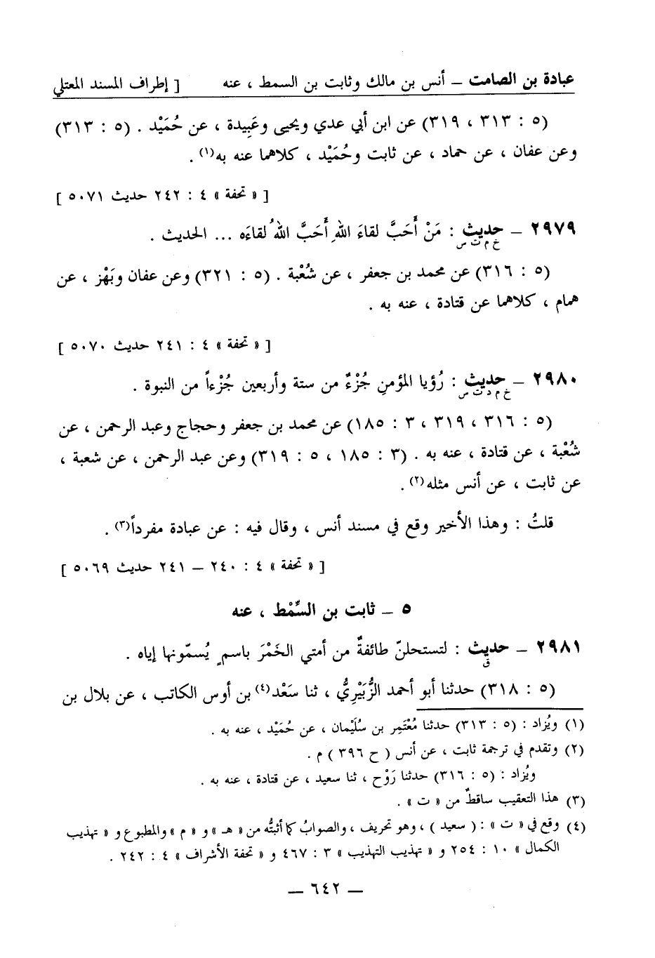 2979 -[خ م ت س] حديث: من أحب لقاء الله أحب الله لقاءه ... الحديث. (5: 316) عن محمد بن جعفر، عن شعبة. (5: 321) وعن عفان وبهز، عن همام، كلاهما عن قتادة، عنه به.