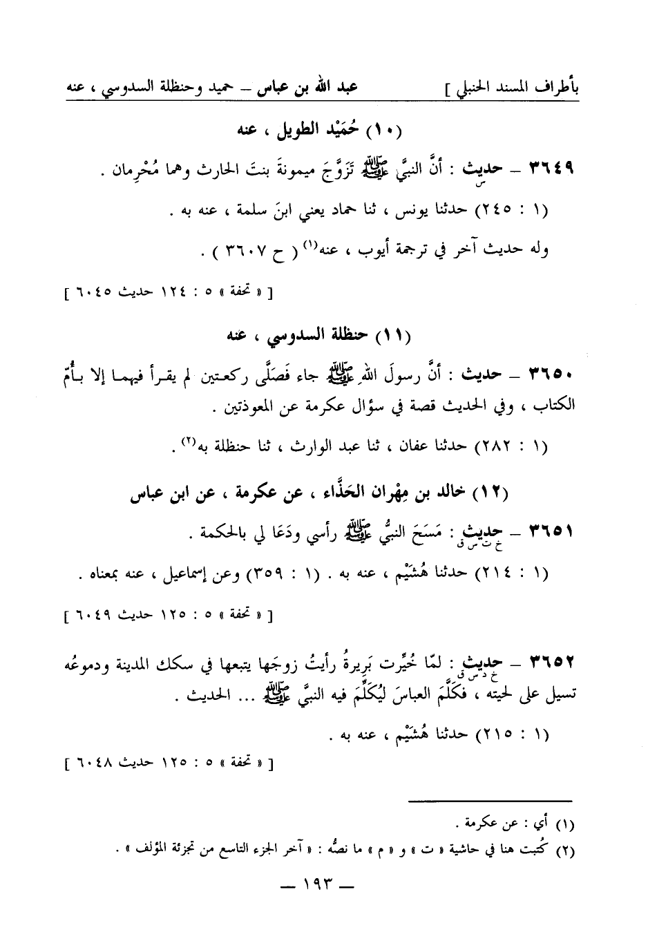 3651 -[خ ت س ق] حديث: مَسَحَ النبيُّ صَلَّى اللَّهُ عَلَيْهِ وَسَلَّمَ رأسي ودَعَا لي بالحكمة. (1: 214) حَدَّثَنا هُشَيم عنه به. (1: 359) وعن إسماعيل عنه بمعناه.