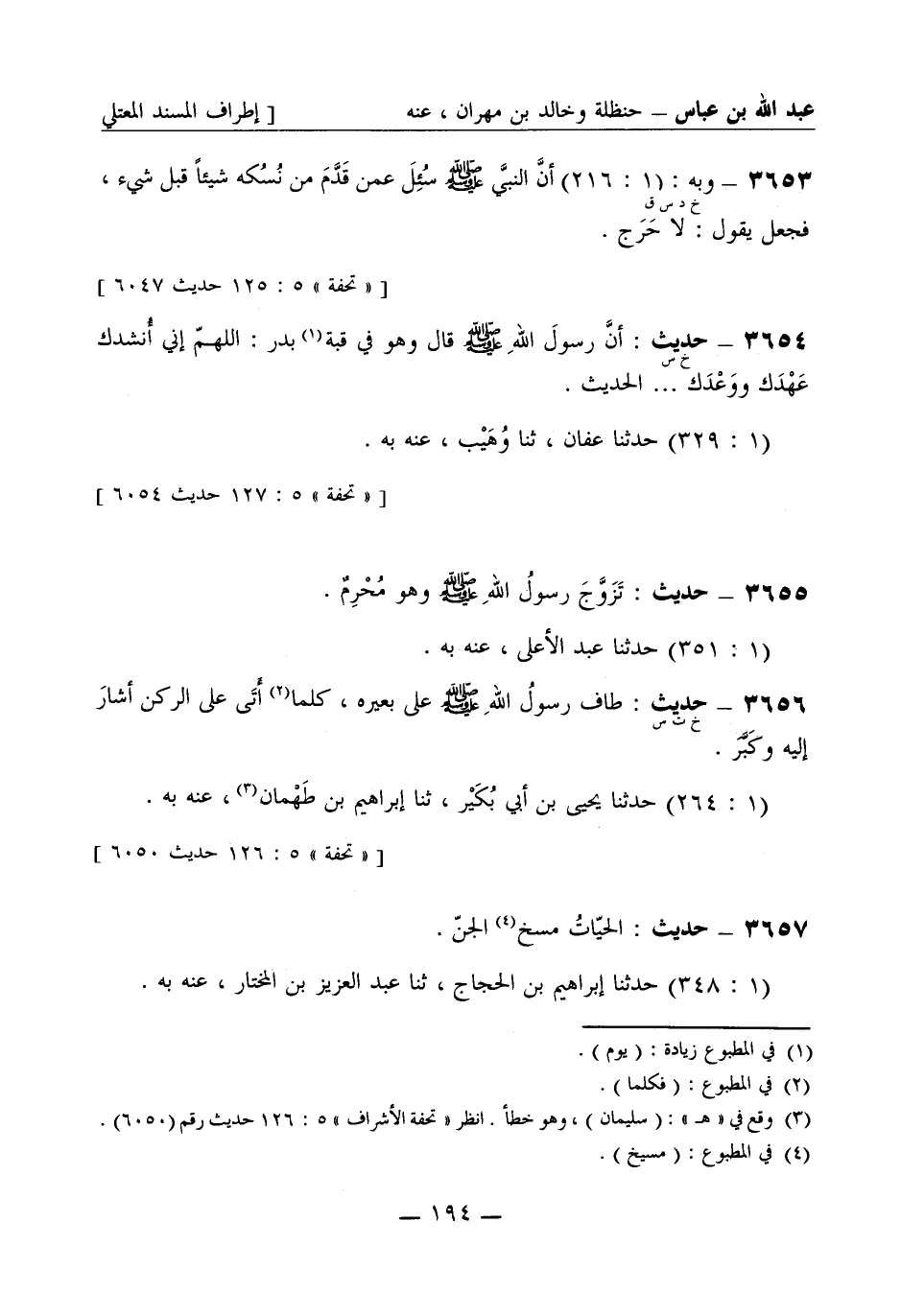 3656 -[خ ت س] حديث: طاف رسولُ الله صَلَّى اللَّهُ عَلَيْهِ وَسَلَّمَ على بعيره كلما أَتَى على الركن أشارَ إليه وكَبَّرَ. (1: 264) حَدَّثَنا يحيى بن أبي بُكَيْر ثنا إبراهيم بن طَهْمان عنه به.