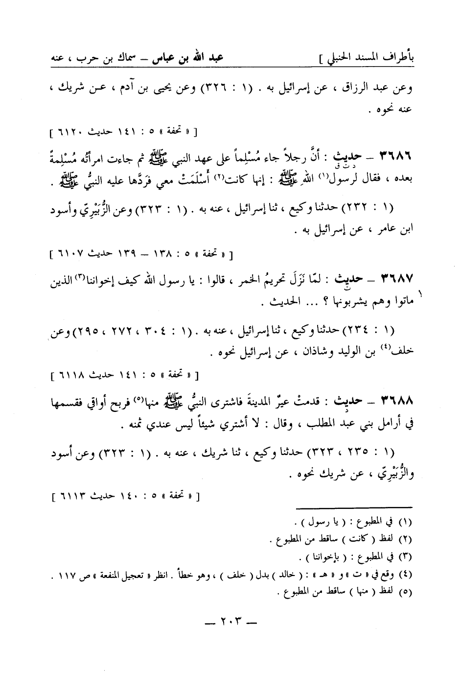 3687 -[ت] حديث: لمّا نَزَلَ تحريمُ الخَمْر، قالوا: يا رسول الله كيف إخواننا الذين ماتوا وهم يشربونها؟ ... الحديث. (1: 234) حَدَّثَنا وكيع، ثنا إسرائيل عنه به. (1: 304، 272، 295) وعن خلف بن الوليد وشاذان، عن إسرائيل نحوه.