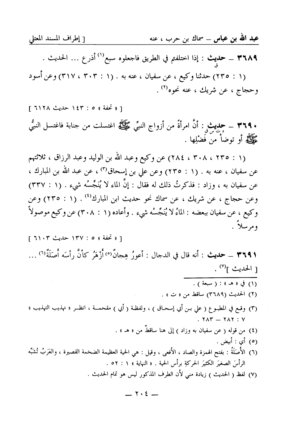 3690 -[د ت س ق] حديث: أنَّ امرأةً من أزواج النبيِّ صَلَّى اللَّهُ عَلَيْهِ وَسَلَّمَ اغتسلت من جنابة فاغتسل النبيُّ صَلَّى اللَّهُ عَلَيْهِ وَسَلَّمَ أو توضأ من فَضْلِها. (1: 235، 308، 284) عن وكيع وعبد الله بن الوليد وعبد الرزاق، ثلاثتهم عن سفيان عنه به. (1: 235) وعن علي بن إسحاق عن عبد الله بن المبارك، عن سفيان به، وزاد فذكرتُ ذلك له فقال: إنَّ الماء لا يُنَجِّسُه شيء. (1: 337) وعن حجاج عن شريك عن سِمَاك نحو حديث ابن المبارك. (1: 235) وعن وكيع، عن سفيان ببعضه: الماءُ لا يُنَجِّسُه شيء. وأعاده (1: 308) عن وكيع موصولاً ومرسلاً.