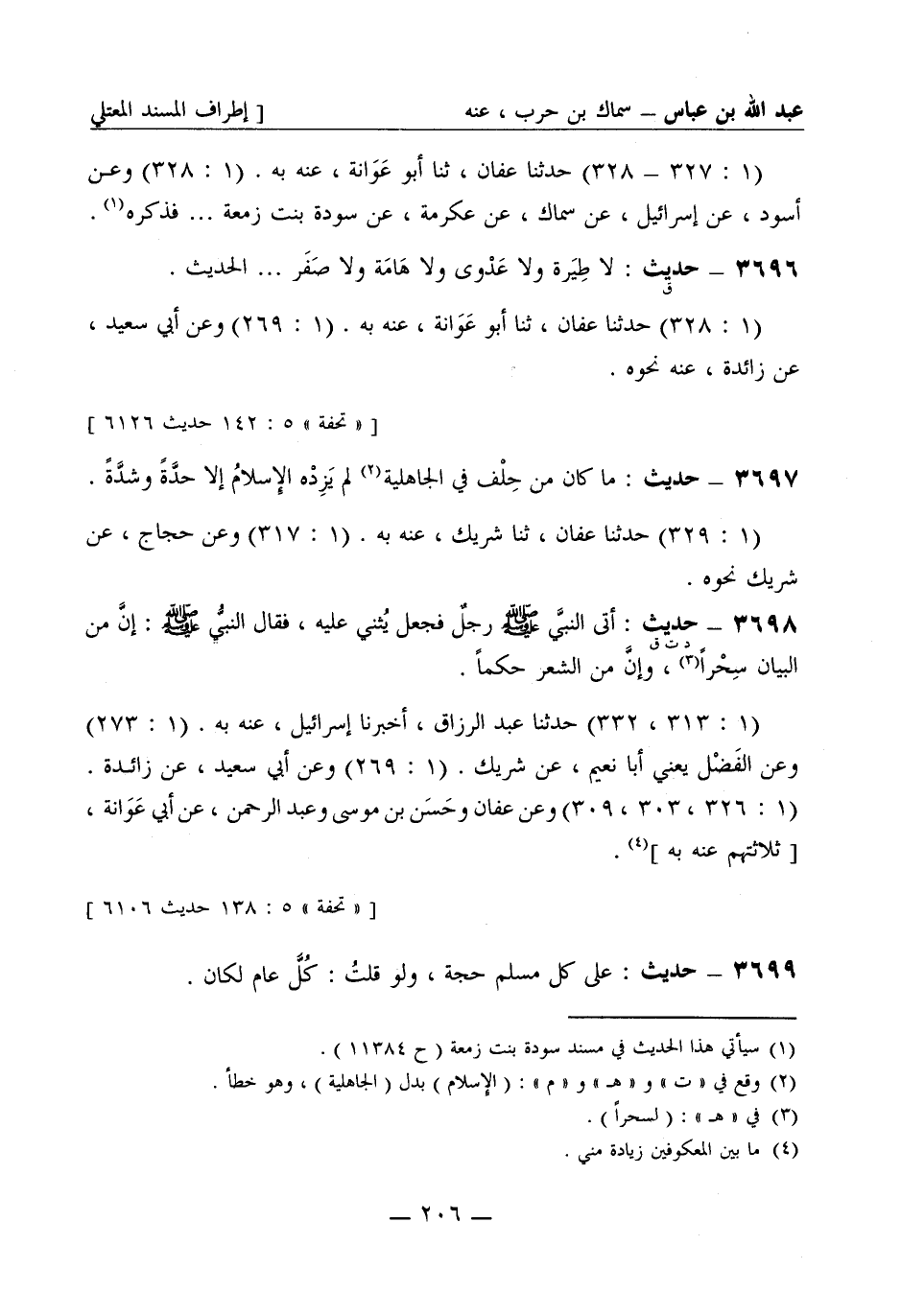 3698 -[د ت ق] حديث: أتى النبيَّ صَلَّى اللَّهُ عَلَيْهِ وَسَلَّمَ رجلٌ فجعل يُثني عليه، فقال النبيُّ صَلَّى اللَّهُ عَلَيْهِ وَسَلَّمَ: إنَّ من البيان سِحْراً، وإنَّ من الشعر حكماً. (1: 313، 332) حَدَّثَنا عبد الرزاق، أخبرنا إسرائيل، عنه به. (1: 273) وعن الفَضْل يعني أبا نعيم، عن شريك. (1: 269) وعن أبي سعيد، عن زائدة. (1: 326، 303، 309) وعن عفان وحَسَن بن موسى وعبد الرحمن عن أبي عَوَانة، ثلاثتهم عنه به.