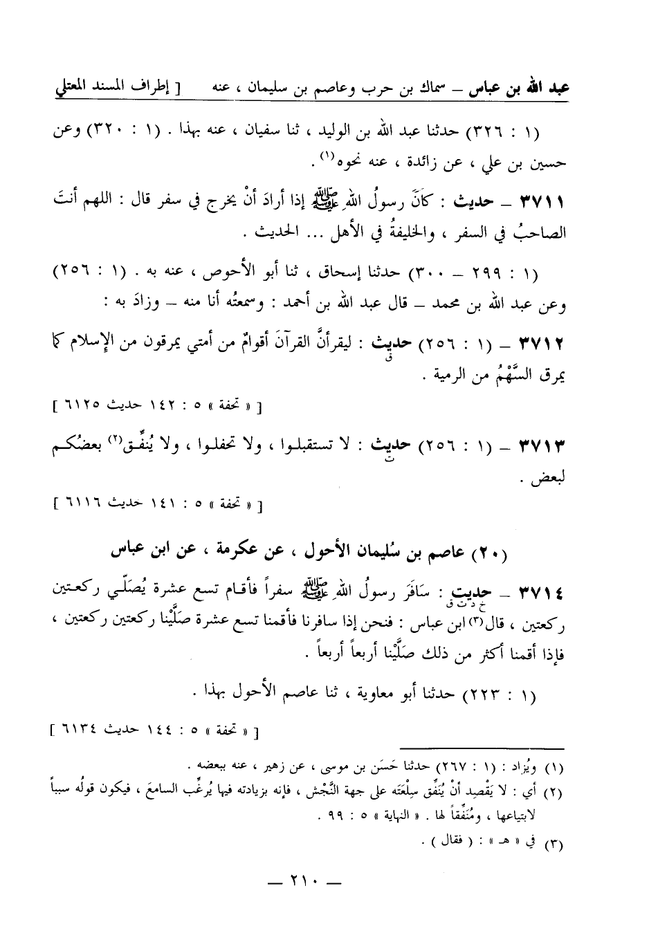 3714 -[خ د ت ق] حديث: سَافَرَ رسولُ الله صَلَّى اللَّهُ عَلَيْهِ وَسَلَّمَ سَفَراً فأقام تسع عشرة يُصَلّي ركعتين ركعتين قال ابن عباس: فنحن إذا سافرنا فأقمنا تسع عشرة صَلَّيْنا ركعتين ركعتين، فإذا أقمنا أكثر من ذلك صَلَّيْنا أربعاً أربعاً. (1: 223) حَدَّثَنا أبو معاوية ثنا عاصم الأحول بهذا.
