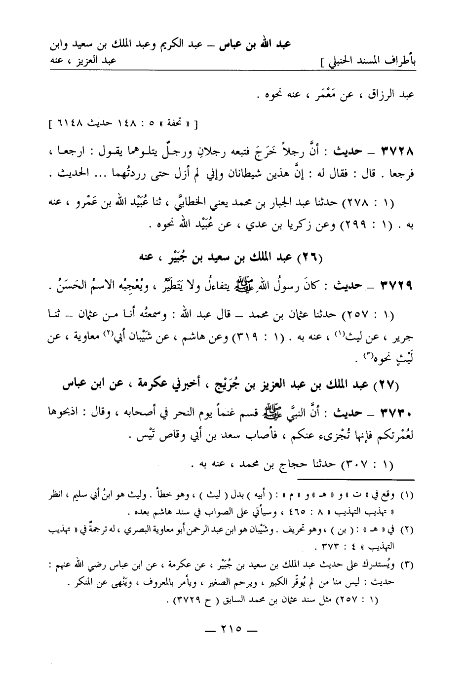 3730 - حديث: أنَّ النبيَّ صَلَّى اللَّهُ عَلَيْهِ وَسَلَّمَ قسم غنماً يوم النَّحْر في أصحابه وقال: اذبحوها لعُمْرتكم فإنها تُجْزئ عنكم، فأصاب سعد بن أبي وقاص تَيْس. (1: 307) حَدَّثَنا حجاج بن محمد عنه به.