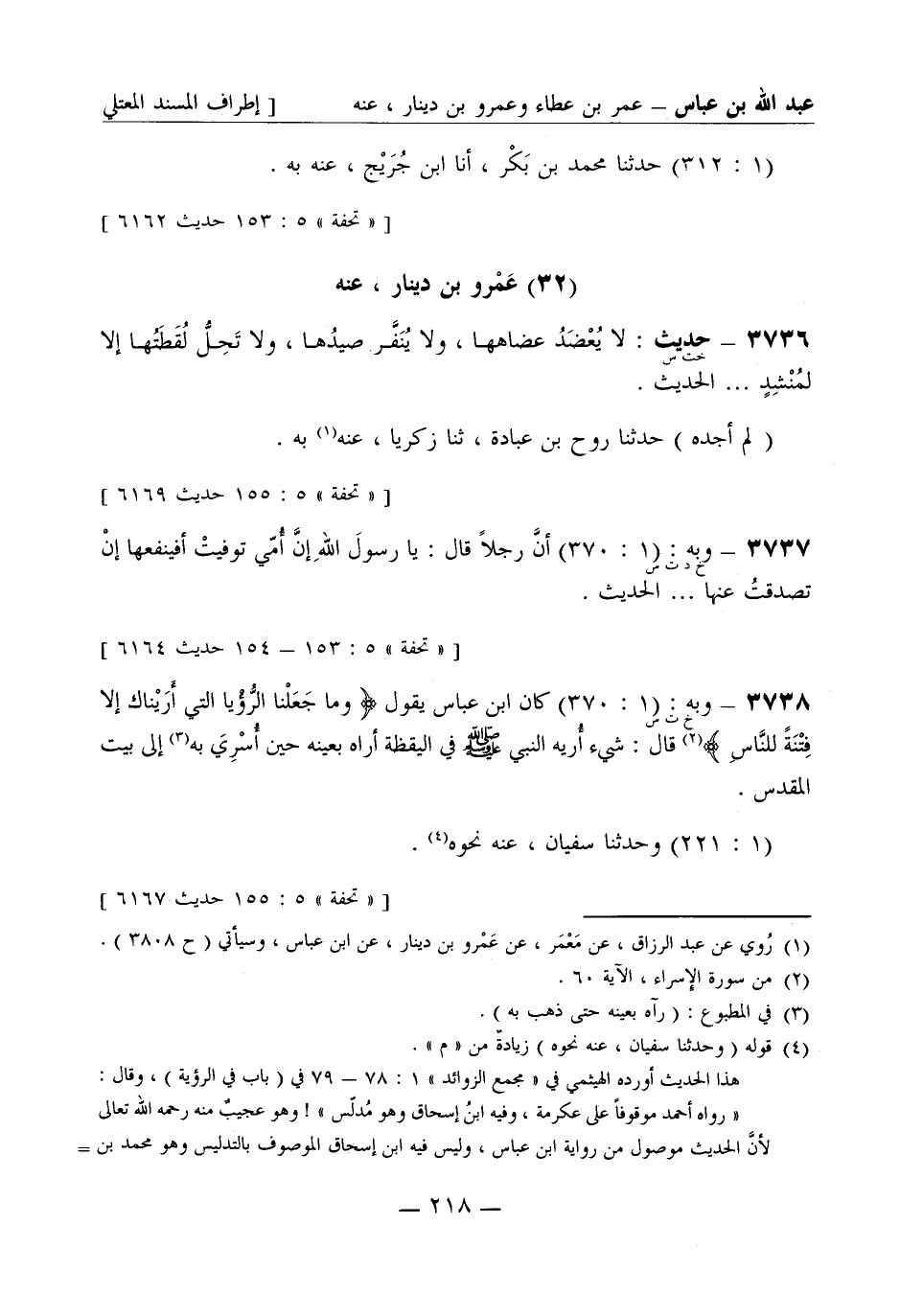 3738 - وبه: (1: 370) كان ابن عباس يقول: وما جَعَلْنا الرُّؤْيا التي أَرَيْناك إلا فِتْنَةً للنَّاس قال: شيء أُريه النبيّ صَلَّى اللَّهُ عَلَيْهِ وَسَلَّمَ في اليقظة أراه بعينه حين أرسي به إلى بيت المقدس. (1: 221) وحَدَّثَنا سفيان، عنه نحوه.