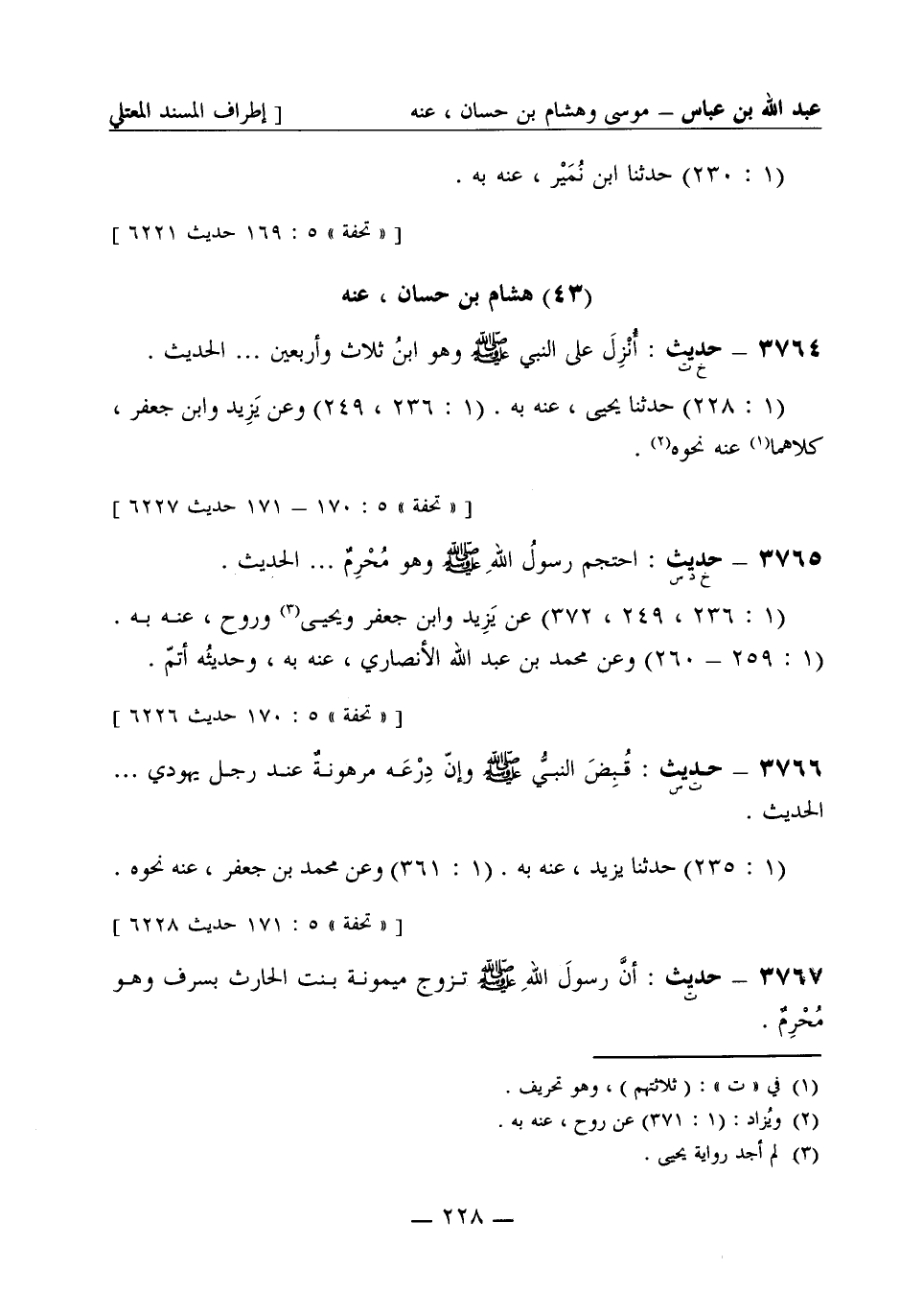 3767 -[ت] حديث: أنَّ رسولَ الله صَلَّى اللَّهُ عَلَيْهِ وَسَلَّمَ تَزَوَّج ميمونة بنت الحارث بسَرِف وهو مُحْرِم -[229]-. (1: 354) حَدَّثَنا يزيد عنه به. (1: 346) وعن يحيى، عنه نحوه.