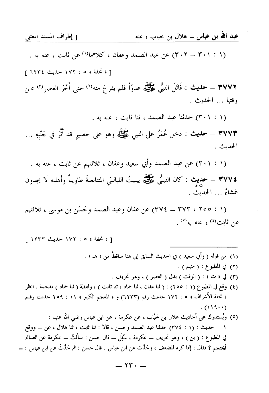3772 - حديث: قَاتَل النبيُّ صَلَّى اللَّهُ عَلَيْهِ وَسَلَّمَ عدوّاً فلم يفرغ منه حتى أَخَّرَ العصر عن وقتها ... الحديث. (1: 301) حَدَّثَنا عبد الصمد، ثنا ثابت عنه به.