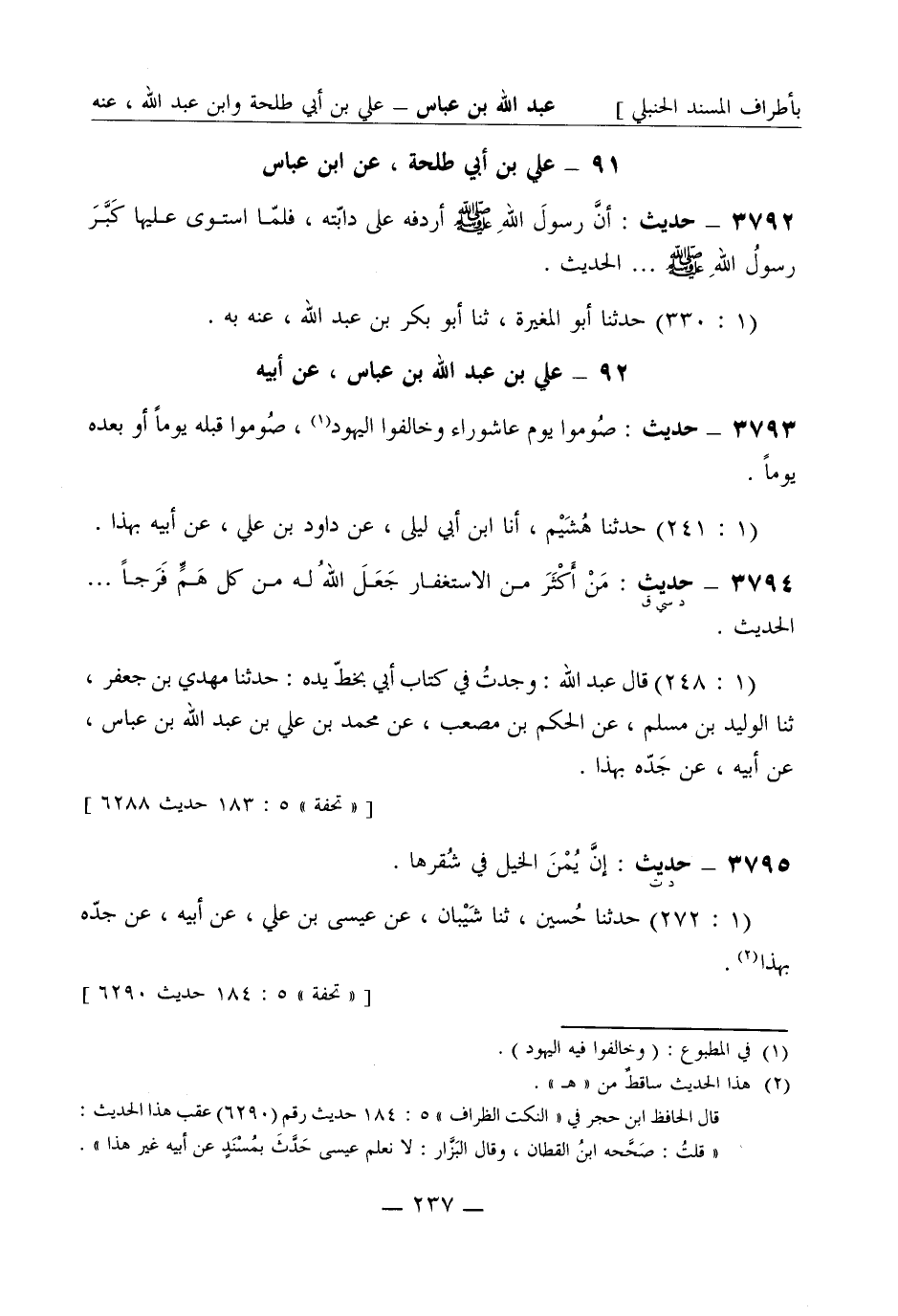 3793 - حديث: صُوموا يوم عاشوراء وخالفوا اليهود، صُوموا قبله يوماً أو بعده يوماً. (1: 241) حَدَّثَنا هُشَيم أنا ابن أبي ليلى، عن داود بن علي، عن أبيه بهذا.