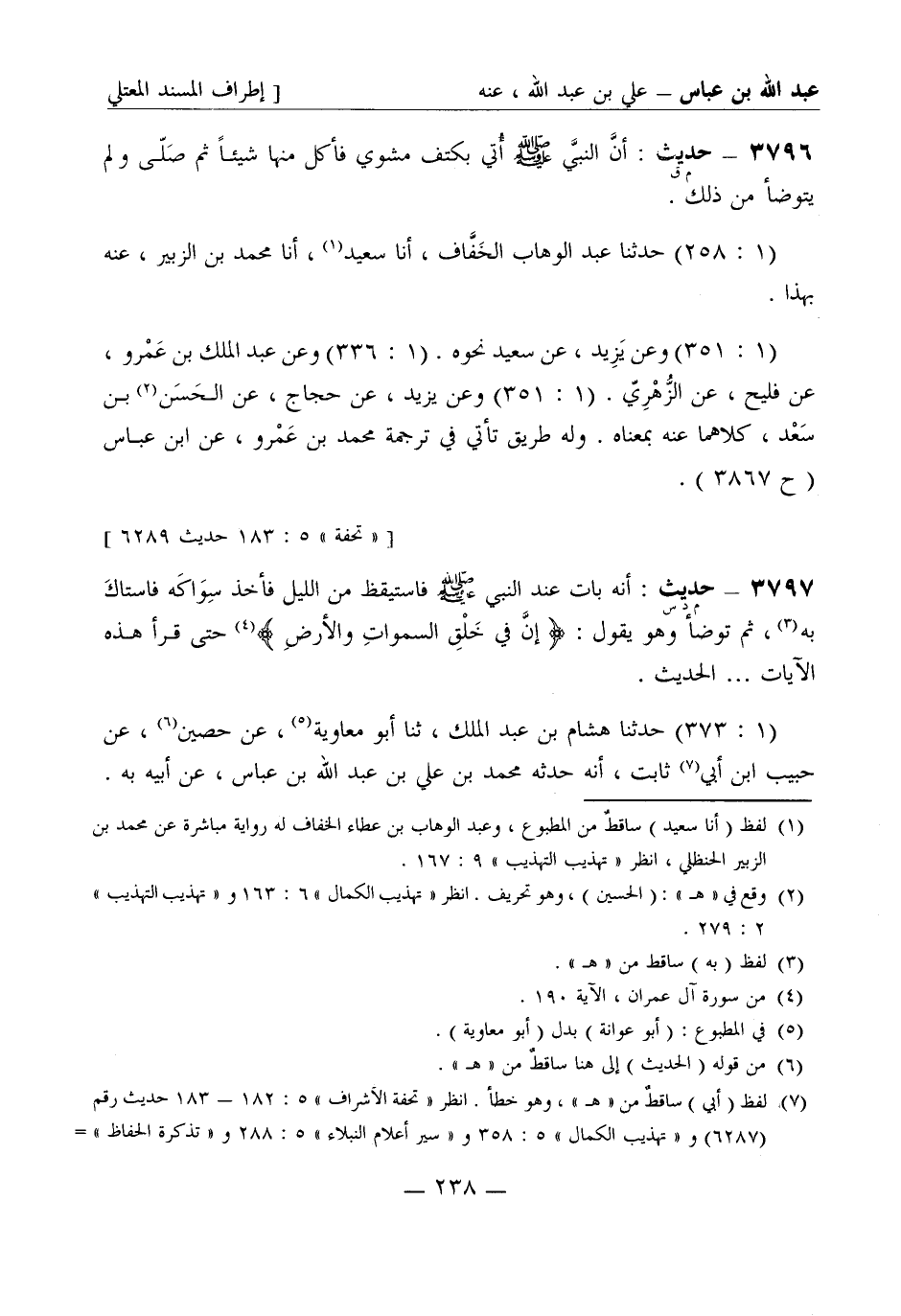 3797 -[م د س] حديث: أنه بات عند النبيّ صَلَّى اللَّهُ عَلَيْهِ وَسَلَّمَ فاستيقظ من الليل فأخذ سِوَاكَه فاستاكَ به ثم توضأ وهو يقول: إنَّ في خَلْقِ السماواتِ والأرض حتى قرأ هذه الآيات ... الحديث. (1: 373) حَدَّثَنا هشام بن عبد الملك ثنا أبو معاوية عن حصين عن حبيب بن أبي ثابت أنه حَدَّثَه محمد بن علي بن عبد الله بن عباس، عن أبيه به -[239]-. (1: 350) وعن معاوية بن هشام، عن سفيان، عن حبيب ببعضه.
