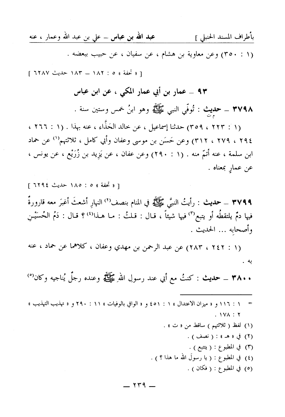 3800 - حديث: كنتُ مع أبي عند رسولِ الله صَلَّى اللَّهُ عَلَيْهِ وَسَلَّمَ وعنده رجلٌ يُناجيه وكان -[240]- كالمُعْرِض عن أبي ... الحديث في رؤيته لجبريل. (1: 293 - 294، 312) عن حَسَن وأبي كامل وعفان، ثلاثتهم عن حمّاد، عنه به (1: 312) قال عبد الله: حَدَّثَني هُدْبة بن خالد، ثنا حمّاد بن سَلَمة به.