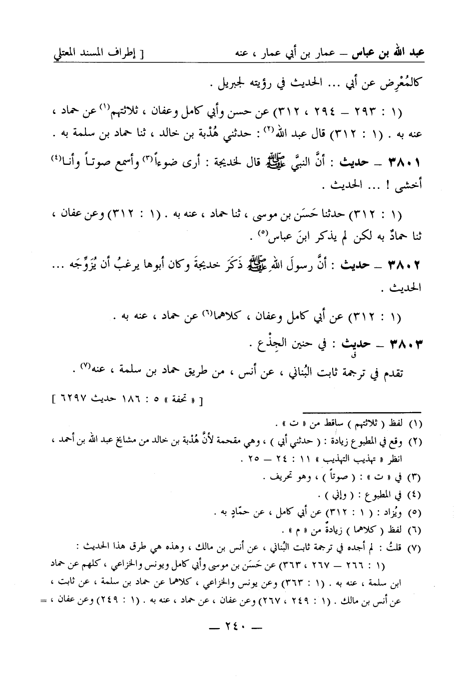 3802 - حديث: أنَّ رسولَ الله صَلَّى اللَّهُ عَلَيْهِ وَسَلَّمَ ذَكَرَ خديجة وكان أبوها يرغبُ أن يُزَوِّجَه ... الحديث. (1: 312) عن أبي كامل، وعفان، كلاهما عن حمّاد، عنه به.