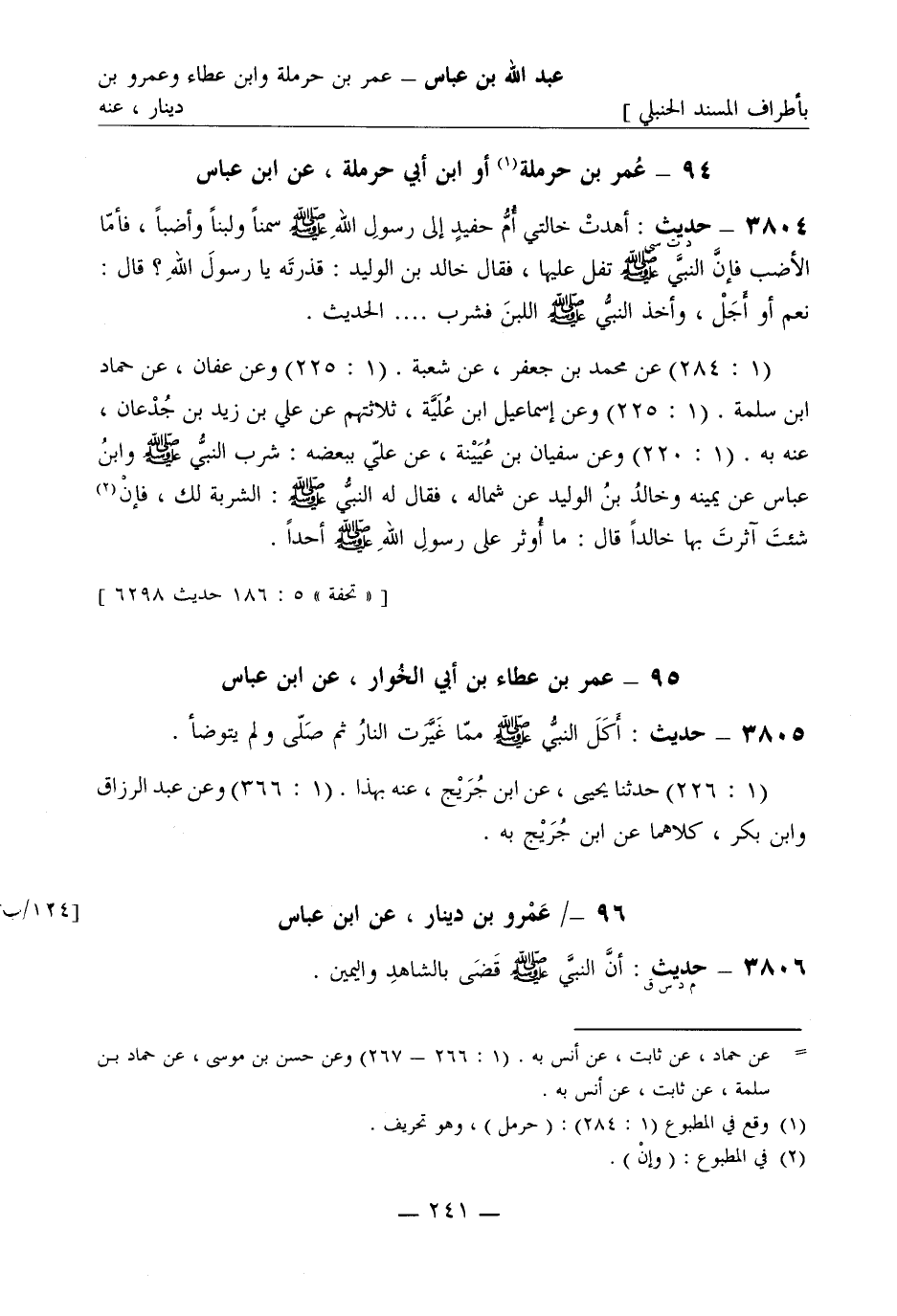 3803 -[د ت سي] حديث: أهدت خالتي أُمُّ حفيدٍ إلى رسولِ الله صَلَّى اللَّهُ عَلَيْهِ وَسَلَّمَ سمناً ولبناً وأضباً، فأمّا الأضب فإنَّ النبيَّ صَلَّى اللَّهُ عَلَيْهِ وَسَلَّمَ تفل عليها، فقال خالد بن الوليد: قذرتَه يا رسولَ الله؟ قال: نعم أو أَجَلْ، وأخذ النبيُّ صَلَّى اللَّهُ عَلَيْهِ وَسَلَّمَ اللبن فشرب ... الحديث. (1: 284) عن محمد بن جعفر، عن شُعبة. (1: 225) وعن عفان عن حمّاد بن سَلَمة. (1: 225) وعن إسماعيل ابن عُلَيَّة، ثلاثتهم عن علي بن زيد بن جُدْعان، عنه به. (1: 220) وعن سفيان بن عُيَينة، عن عليّ ببعضه: شرب النبيُّ صَلَّى اللَّهُ عَلَيْهِ وَسَلَّمَ وابن عباس عن يمينه وخالد بن الوليد عن شماله، فقال له النبيُّ صَلَّى اللَّهُ عَلَيْهِ وَسَلَّمَ: الشربة لك، فإن شئت آثرتَ بها خالداً قال: ما أُوثر على رسولِ الله صَلَّى اللَّهُ عَلَيْهِ وَسَلَّمَ أحداً.