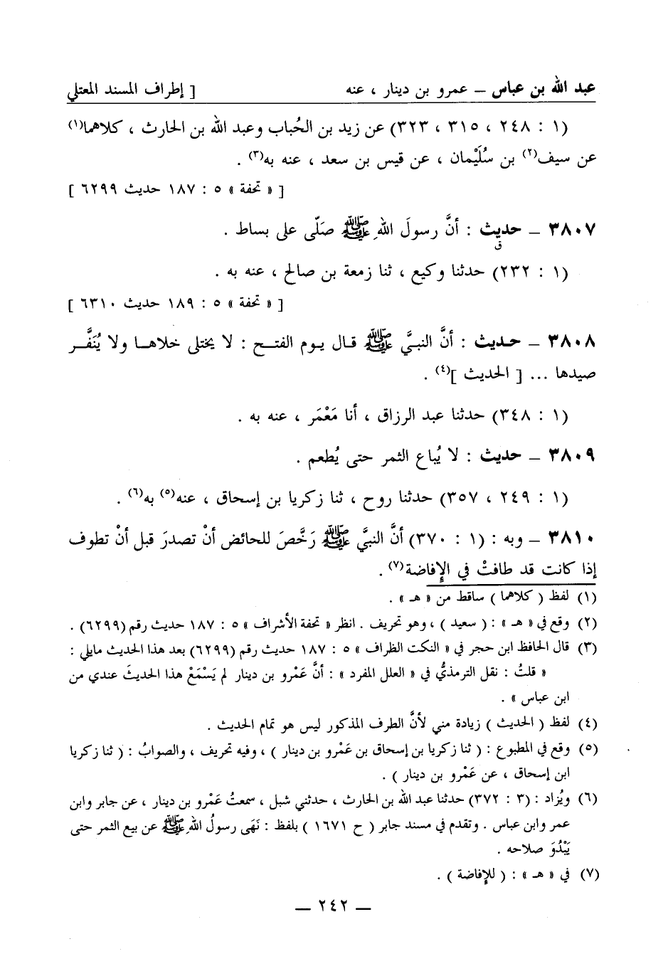3808 - حديث: لا يُباع الثمر حتى يُطعم. (1: 249، 357) حَدَّثَنا رَوْح ثنا زكريا بن إسحاق، عنه به.