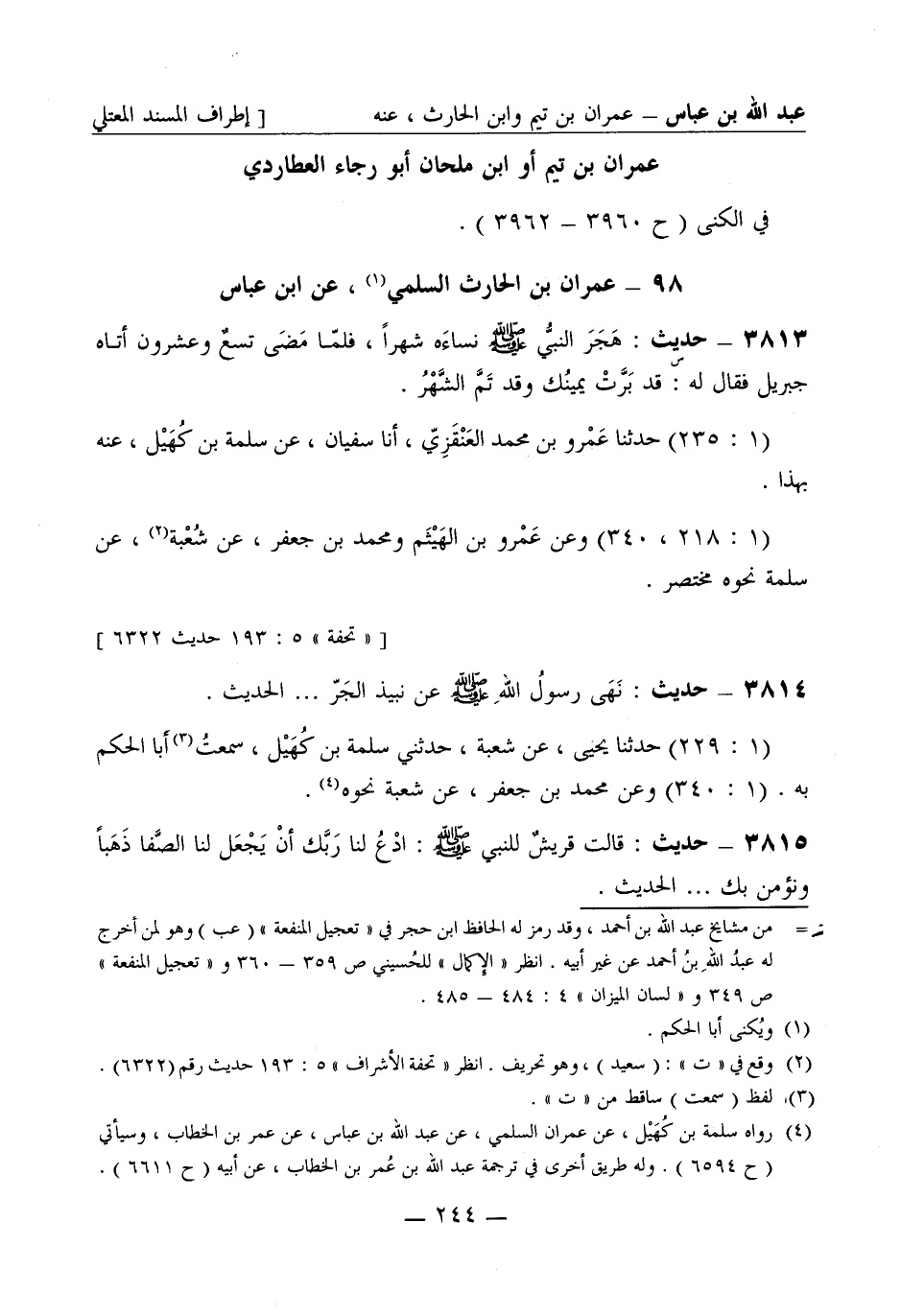 3812 -[س] حديث: هَجَرَ النبيُّ صَلَّى اللَّهُ عَلَيْهِ وَسَلَّمَ نساءَه شَهْراً، فلمّا مَضَى تسعٌ وعشرون أتاه جبريل فقال له: قد بَرَّتْ يمينُك وقد تَمَّ الشَّهْر. (1: 235) حَدَّثَنا عمرو بن محمد العَنْقَزِيّ أنا سفيان عن سلمة بن كُهَيْل عنه بهذا. (1: 218، 340) وعن عمرو بن الهَيْثَم ومحمد بن جعفر عن شُعبة عن سلمة نحوه مختصر.